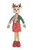 Renne debout décoratif portant un chandail vert, un foulard rayé coloré, des mitaines vertes, une jupe à pois colorée et des chaussures rouges