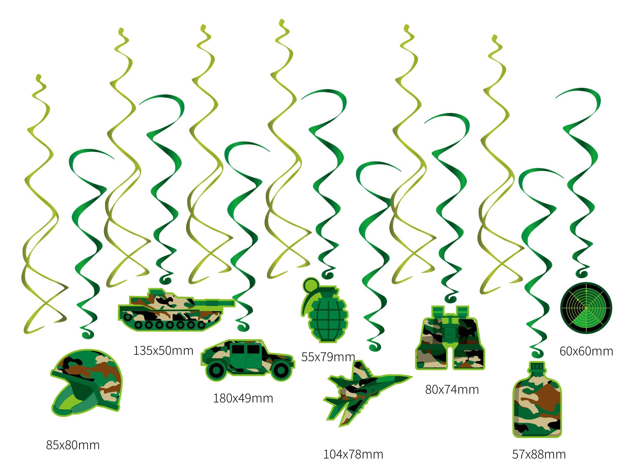 Décorations en aluminium à thème camouflage avec icônes de lʹarmée, comme des casques, débardeurs militaires, avions, jumelles, etc.