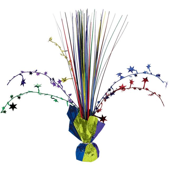 Centre de table lesté qui peut être façonné au thème de votre fête avec de longs brins en aluminium, des pièces métalliques pliables et des étoiles en aluminium attachées
