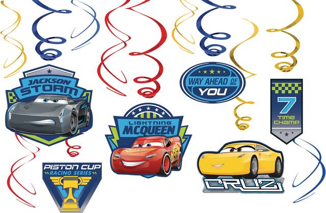 Comprend des décorations spiralées avec des découpes de carton de Flash McQueen, de Cruz Ramirez et de Jackson Storm