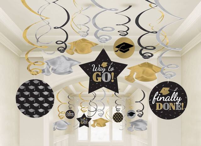 Certains serpentins ont des découpes de chapeaux de diplômé ou des étoiles en plastique