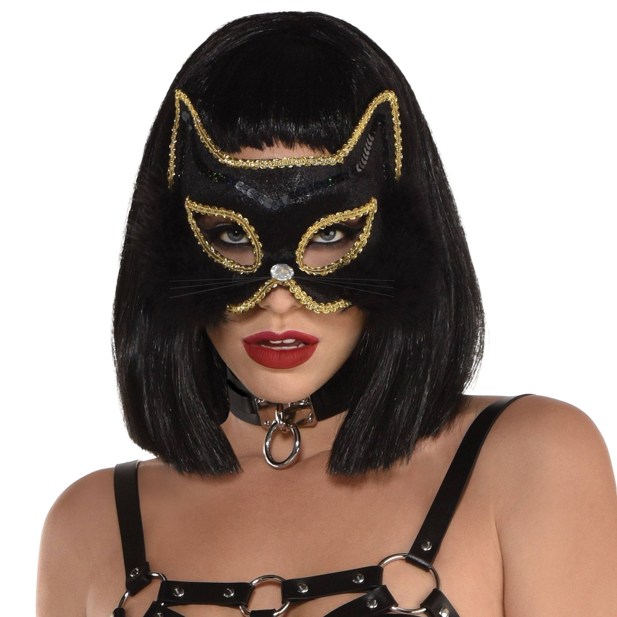 Masque de chat recouvert de plumes de marabout noires et orné d'une bordure dorée