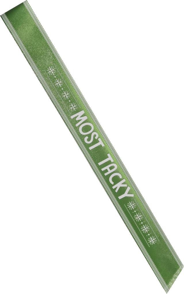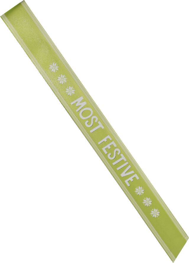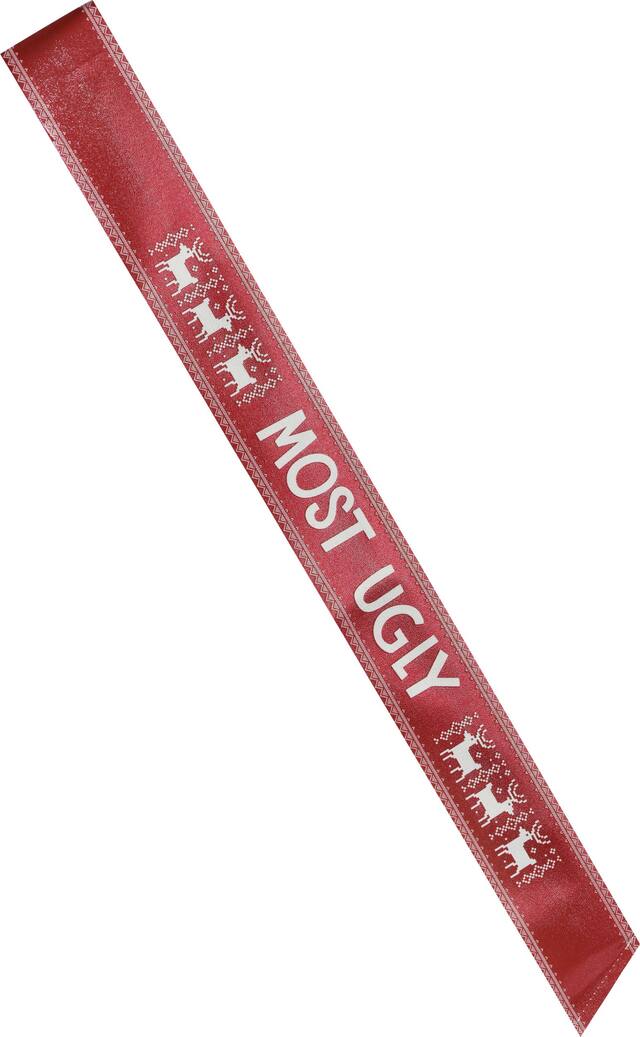 Écharpes mettant en vedette des motifs de Noël et des titres comme « Most Creative », « Most Ugly », « Most Festive » et « Most Tacky »