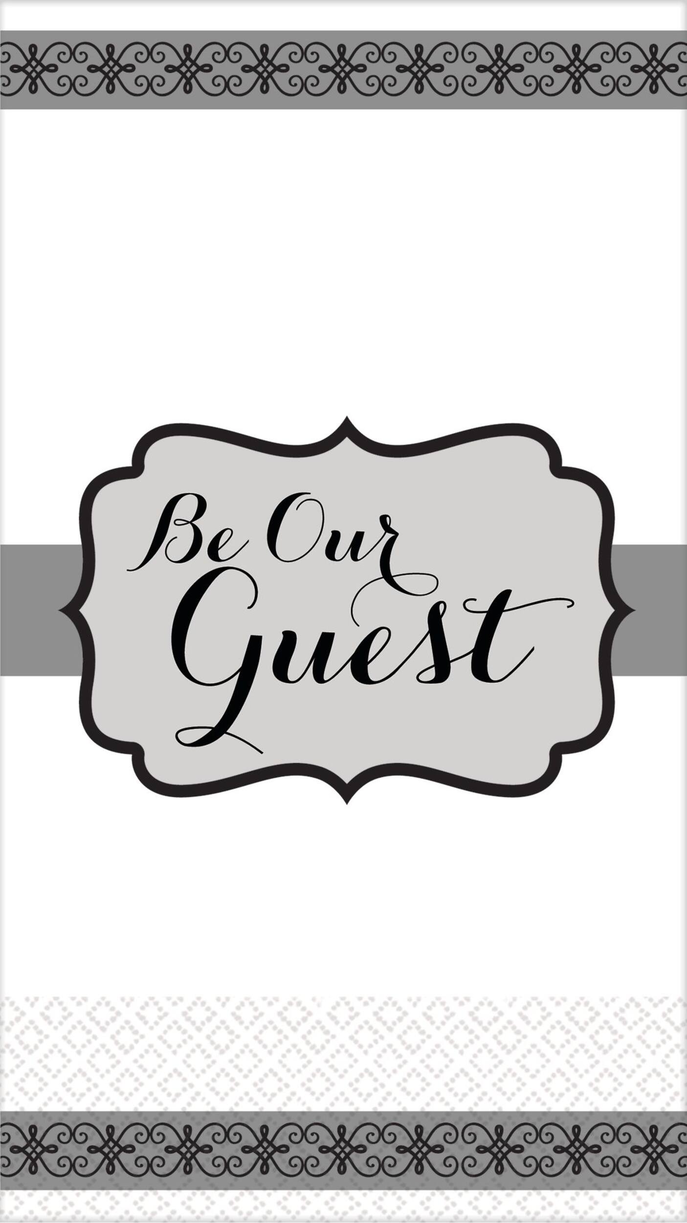 Ces produits similaires présentés ci-dessous pourraient vous intéresser.Essuie-mains d'invité haut de gamme « Be Our Guest », argenté, dotés d'un message « Be our guest » dans un élégant motif de volutes argentées