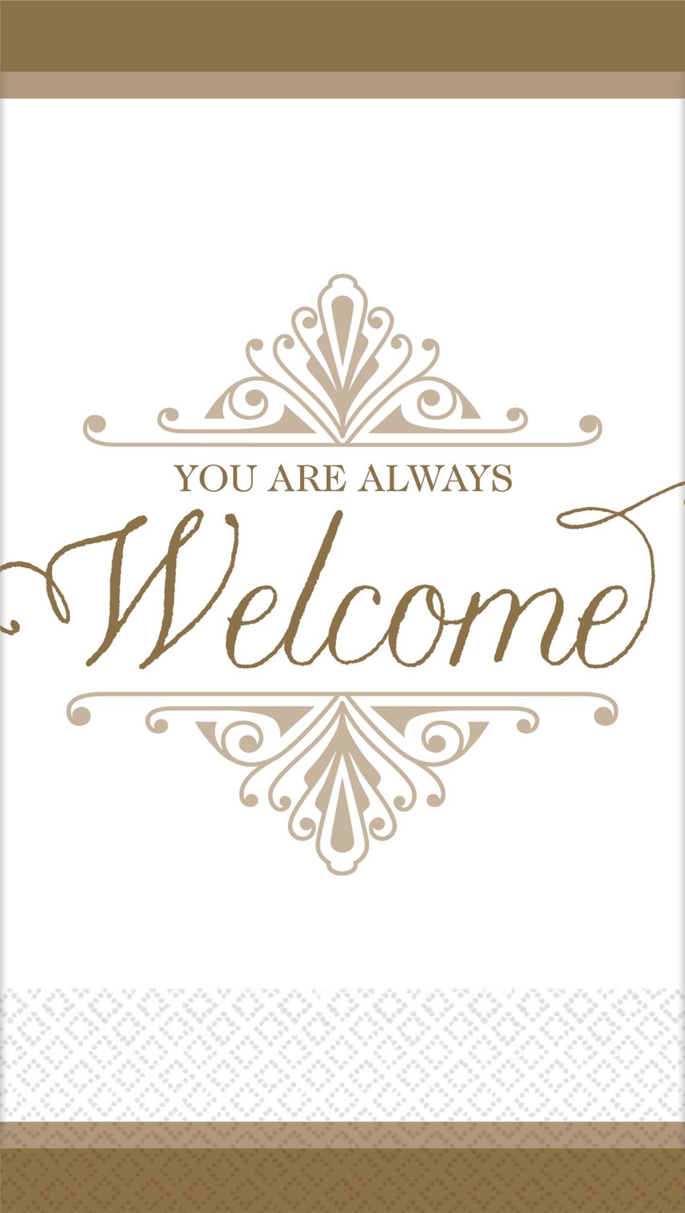 Ces produits similaires présentés ci-dessous pourraient vous intéresser.Essuie-mains d'invité haut de gamme de bienvenue, doré, dotés d'une bordure dorée et d'un message « You are always welcome »