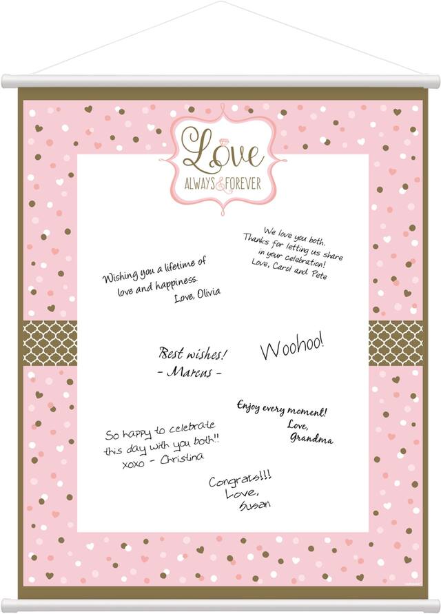 Ces produits similaires présentés ci-dessous pourraient vous intéresser.Feuille de présence de mariage rose pétillant affichant la mention « Love Always and Forever » avec un fond blanc et une bordure rose à pois