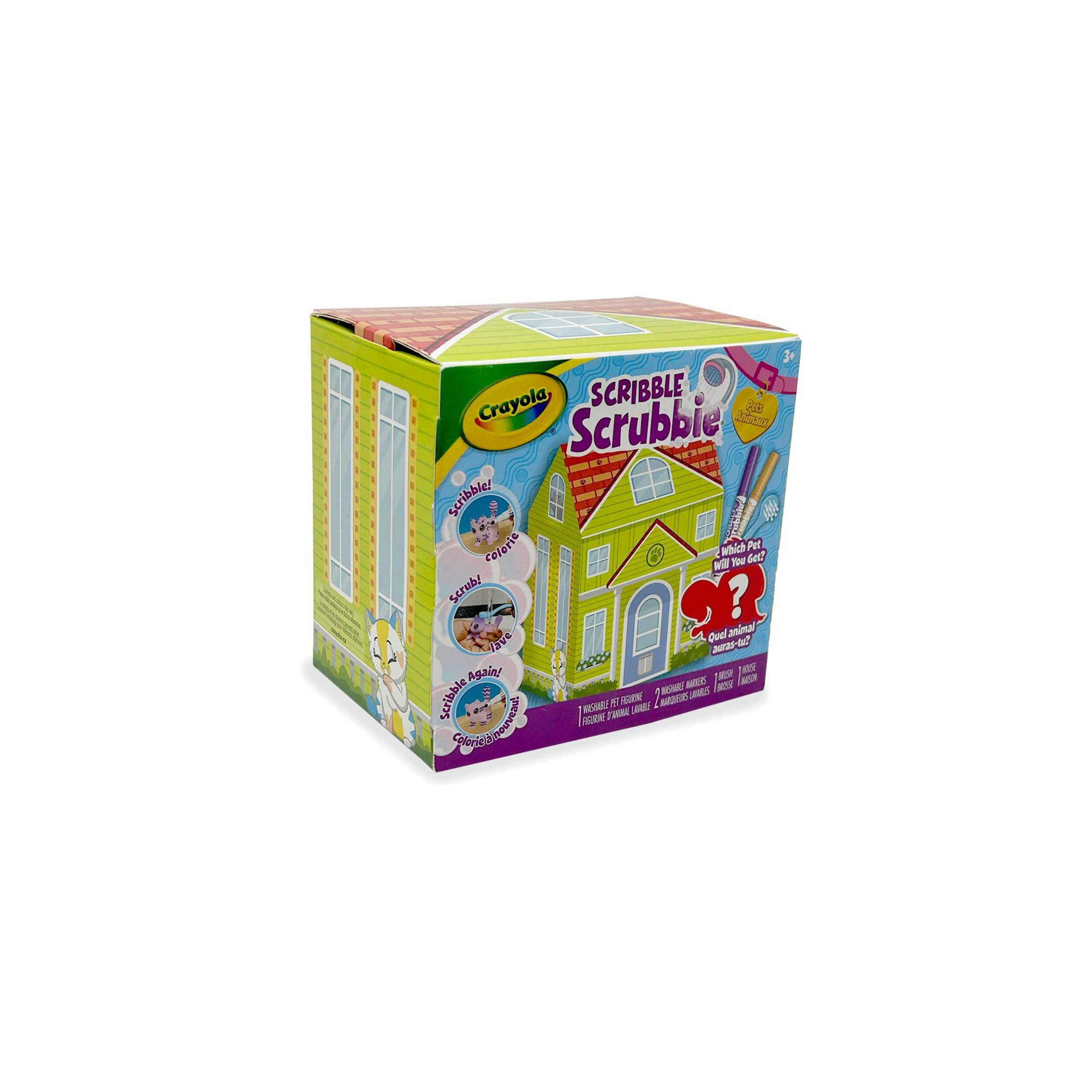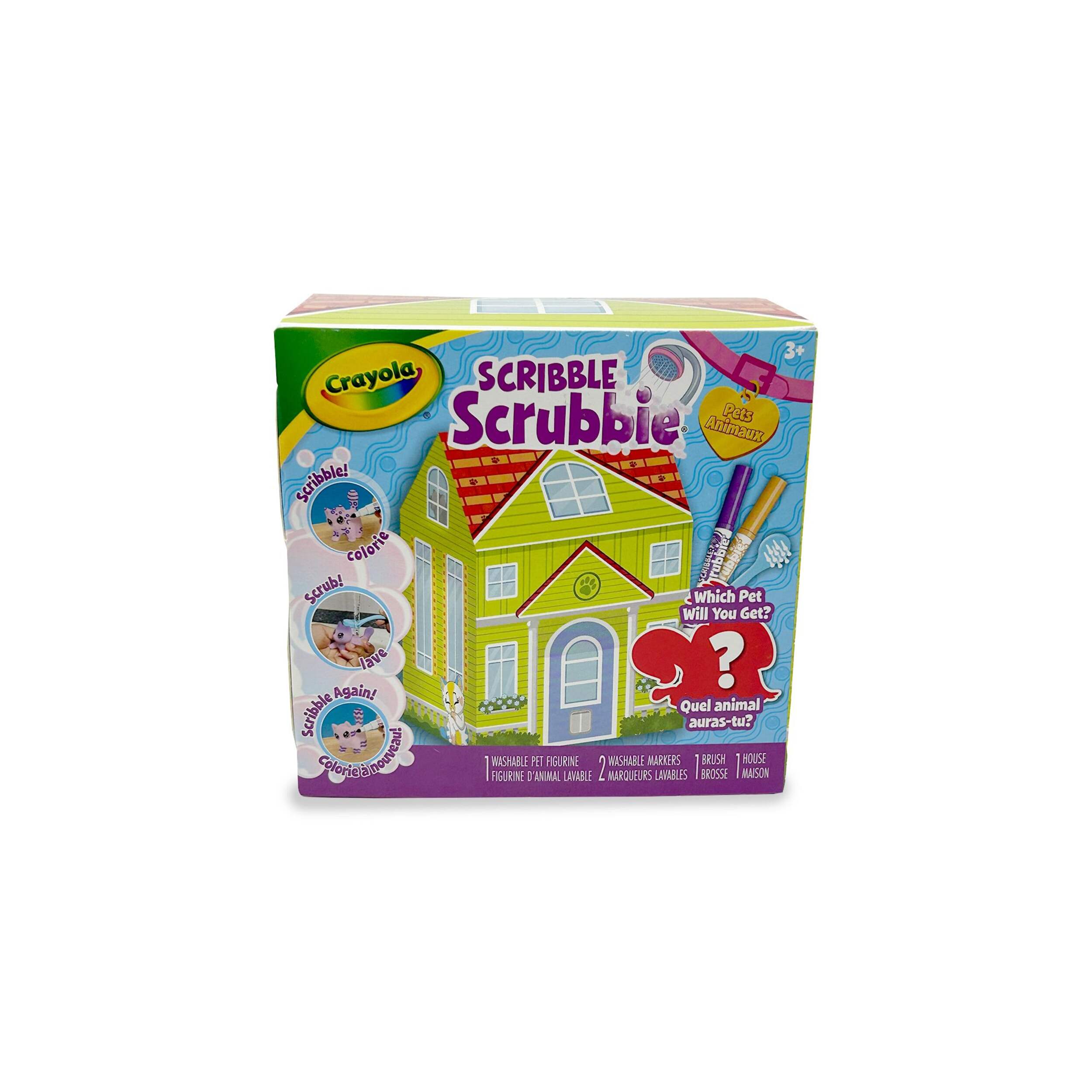 La maisonnette pour animal mystère Scribble Scrubbie de Crayola permet aux enfants de laisser libre cours à leur imagination. Quel animal adopterez-vous? Ce jouet animal mystère ajoute une touche amusante de surprise et permet aux enfants d'agrandir leur collection d'animaux Scribble Scrubbie. Choisissez parmi les marqueurs lavables inclus pour ajouter des motifs uniques à votre figurine d'animal duveteux. Lorsque vous êtes prêt à essayer quelque chose de nouveau, passez de l'eau dessus et lavez-les avec la brosse à récurer incluse. Créez de nouveaux pelages colorés aussi souvent que vous le voulez. Jumelez-le avec un coffret Scribble Scrubbie (vendu séparément) pour encore plus de façons de jouer. Idéal pour les enfants de 3 ans et plus.