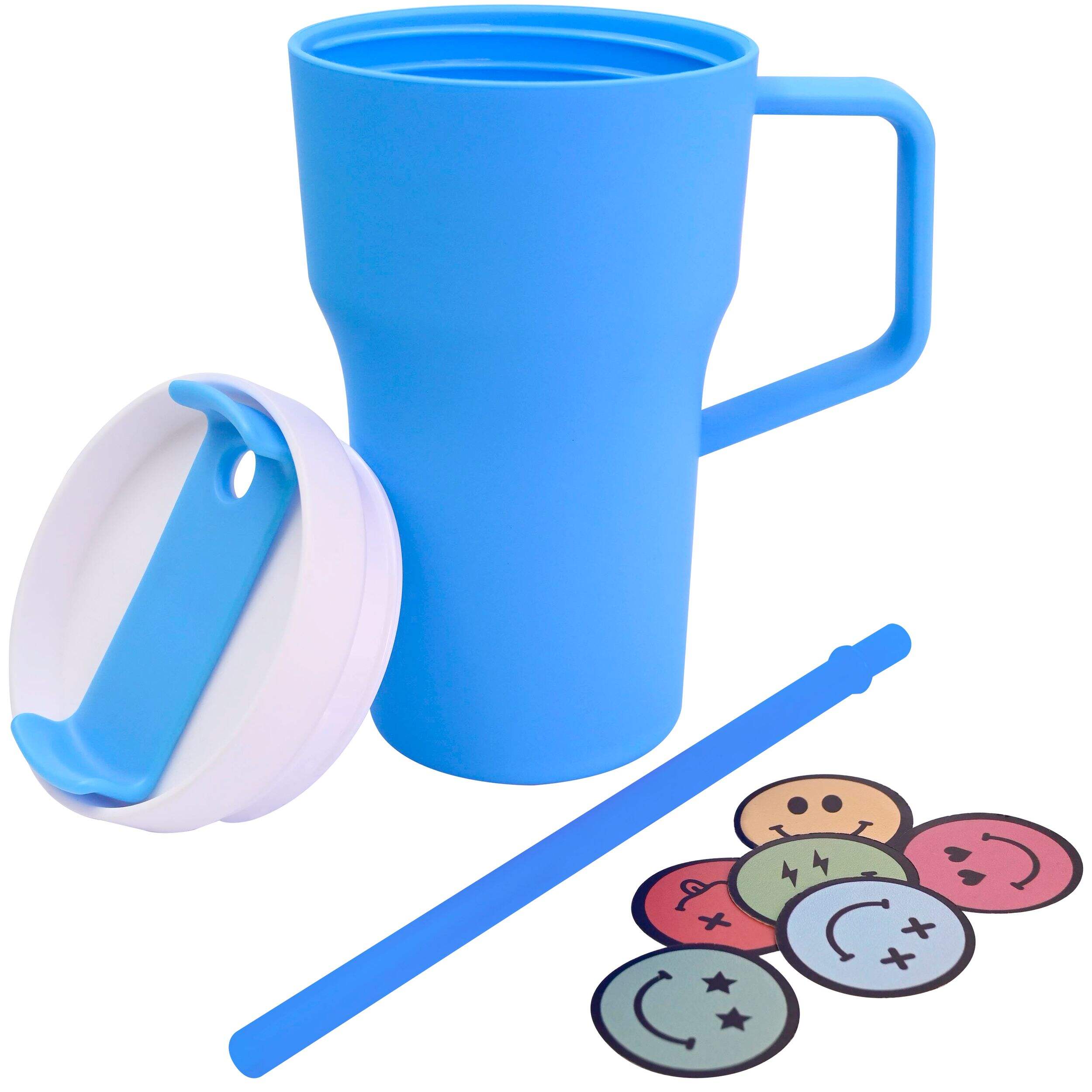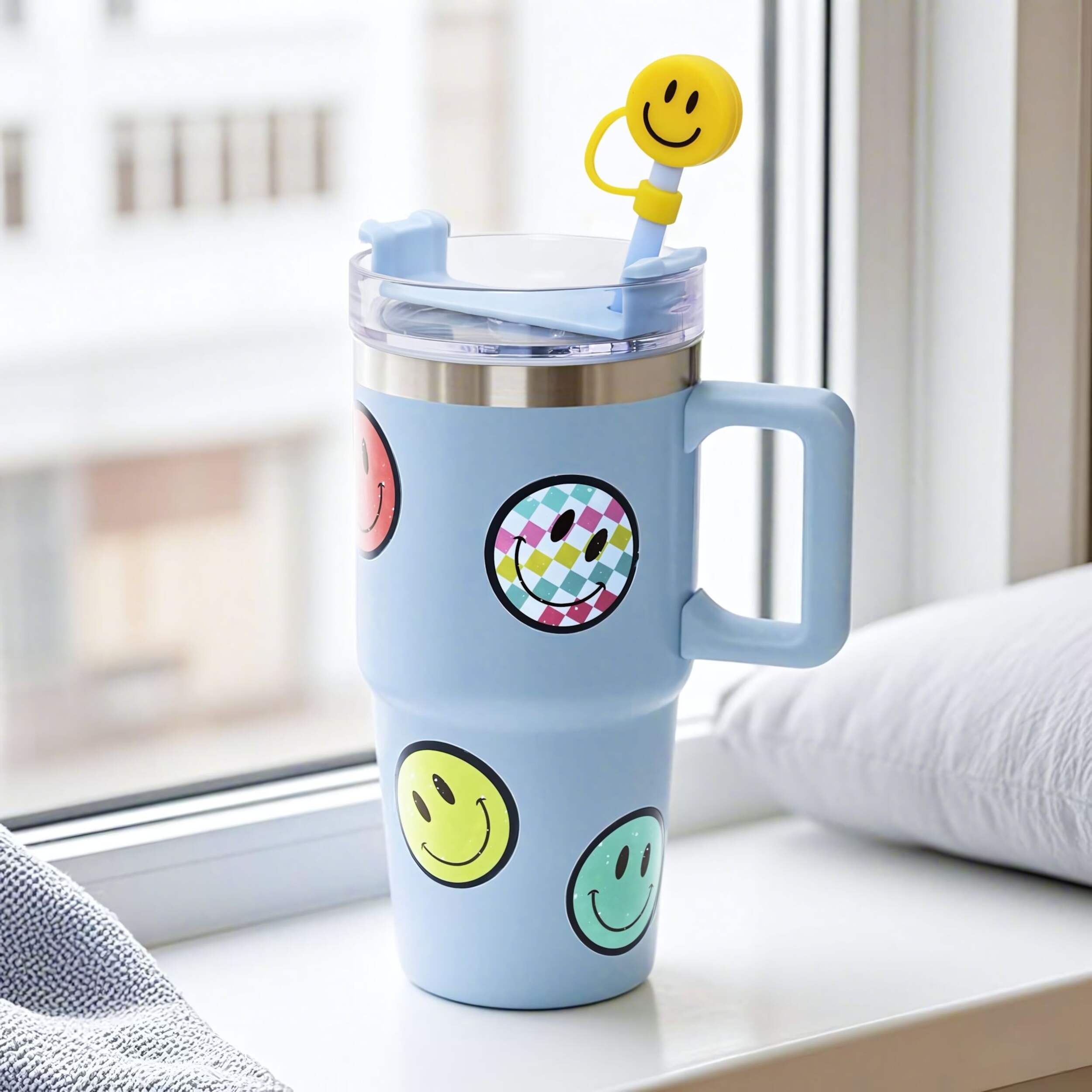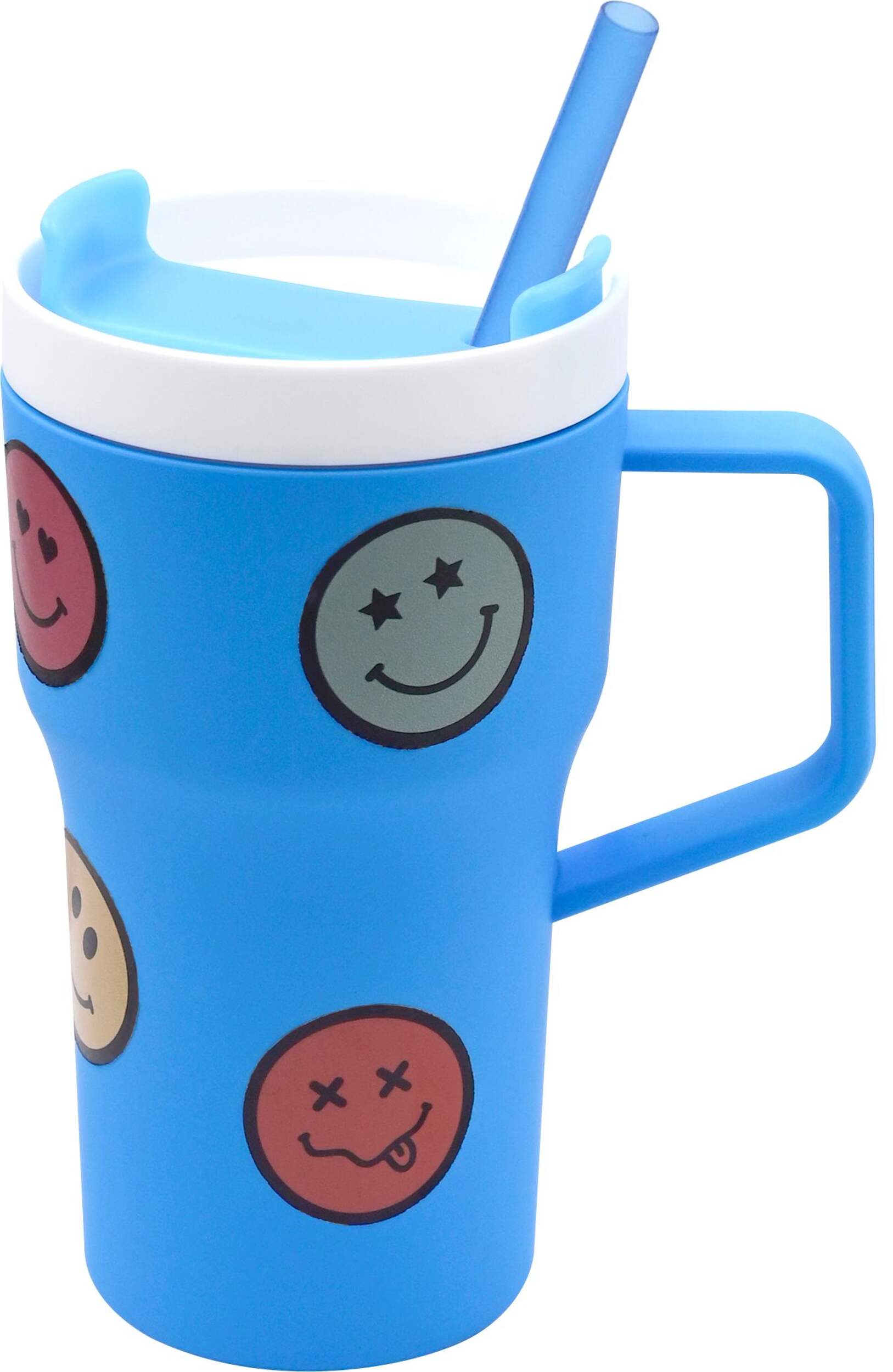 Gobelet bleu fourni avec une paille réutilisable et six autocollants amovibles de visage souriant pour changer votre ambiance quand vous le voulez