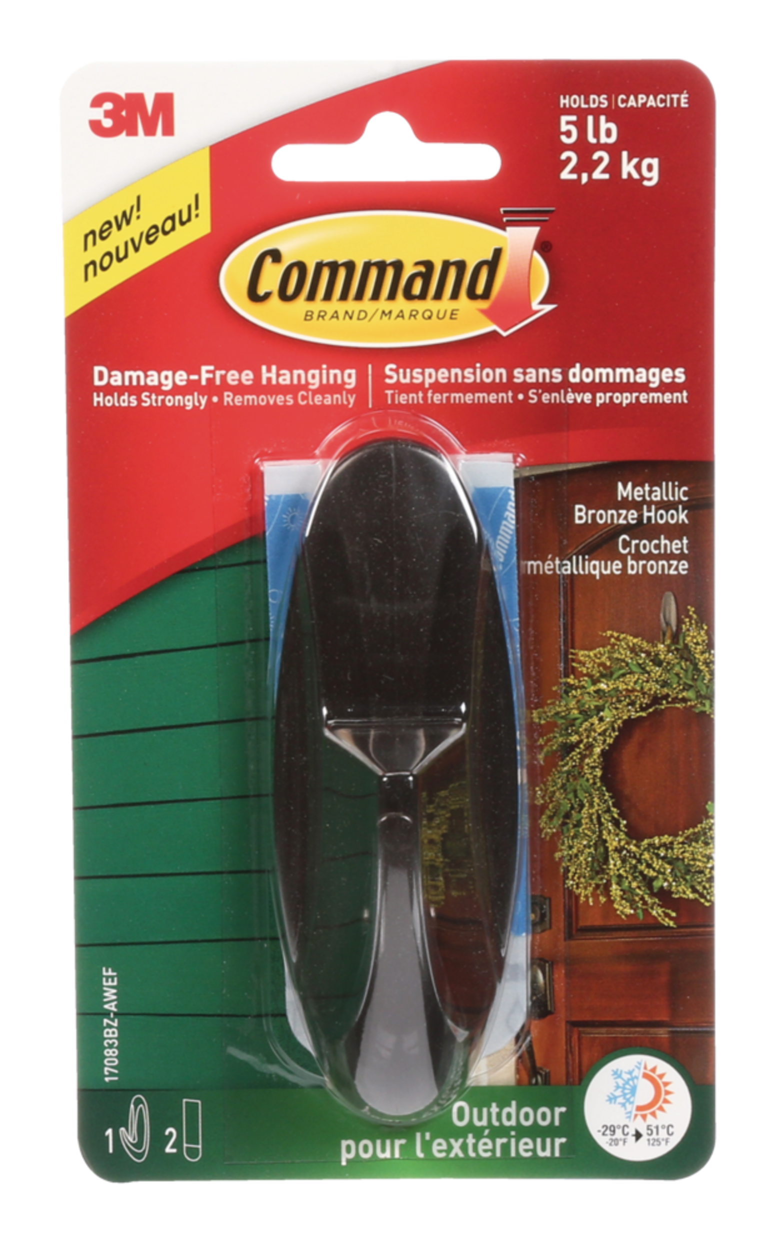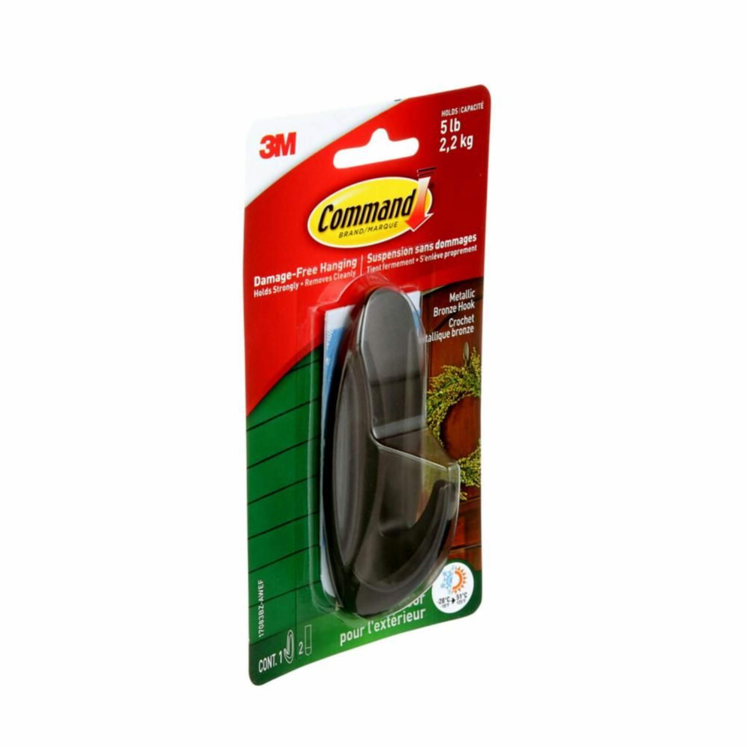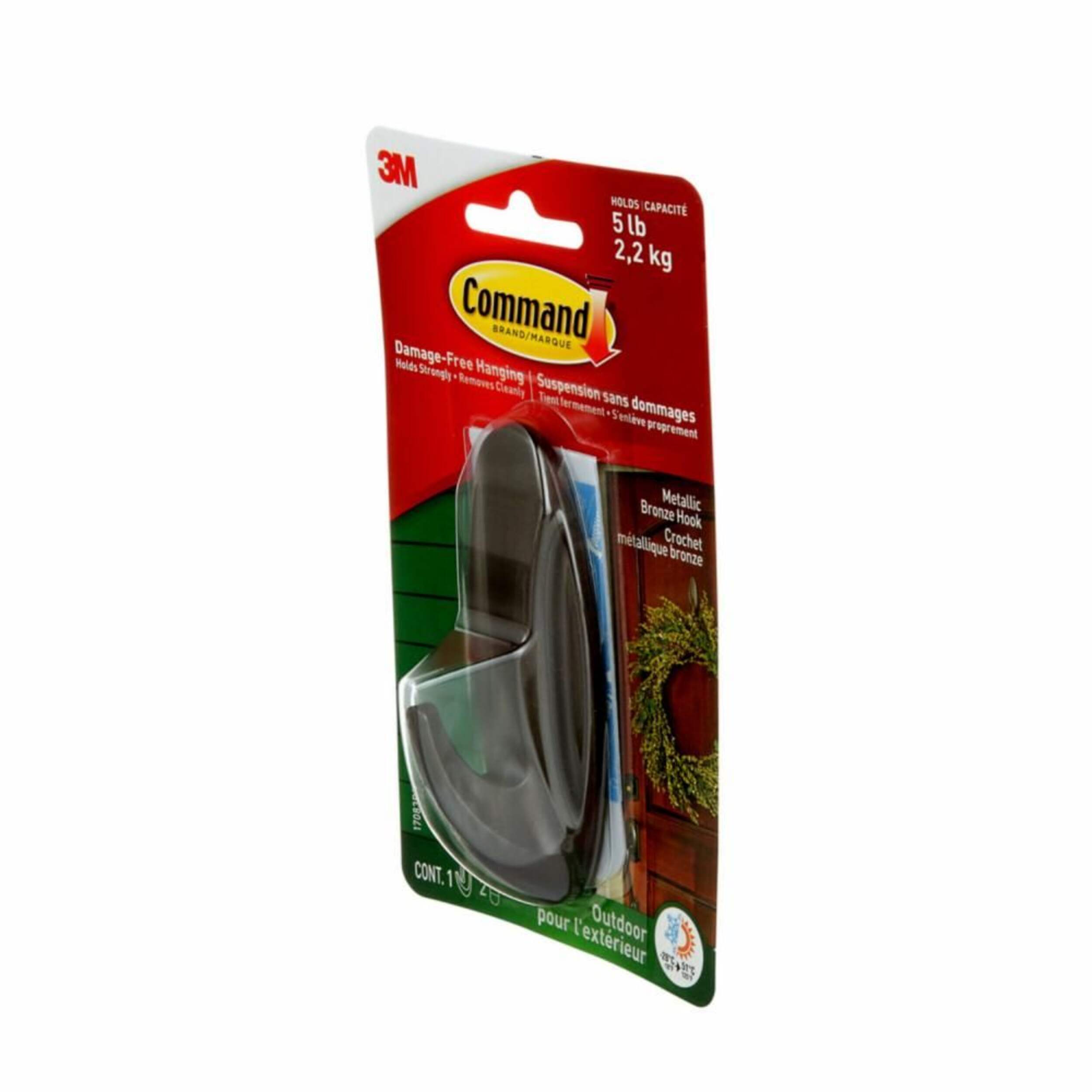 Le grand crochet d'extérieur CommandsupMC/sup Graphite offre une solution polyvalente et durable pour suspendre des articles à l'extérieur. Spécialement conçu pour résister aux températures extrêmes et aux conditions météorologiques difficiles, il peut supporter jusqu'à 2,3 kg (5 lb) tout en restant facile à enlever grâce à l'adhésif CommandsupMC/sup qui prévient les dommages, les trous et les résidus collants. Réutilisable avec les bandes de rechange CommandsupMDsup pour l'extérieur, ce gros crochet assure une performance durable et un retrait propre, ce qui le rend idéal pour les décorations saisonnières, les outils et plus encore.