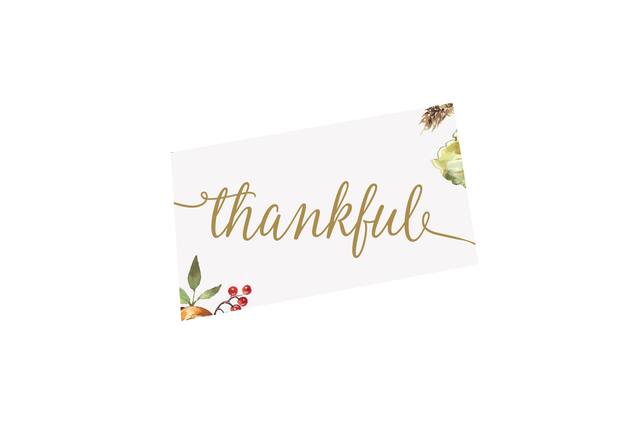 Doté d'une bordure brune avec des feuilles, des citrouilles et des pommes, avec le mot « Thankful » au centre