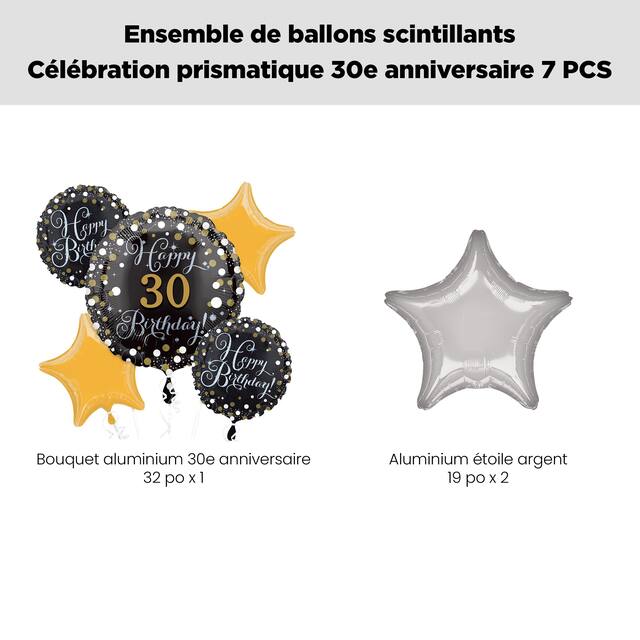 Contenu de l'ensemble : 1 bouquet de ballons prismatiques Happy 30 Birthday! de 32 po, ballons prismatques Happy Birthday de 18 po, 2 ballons en aluminium étoile dorée de 18 po (UCS 8424107) et 2 ballons en aluminium étoile argentée de 18 po (UCS 8423944)