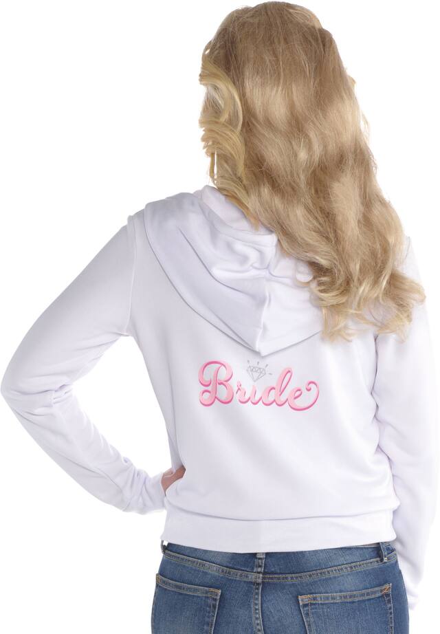 Chandail blanc à capuchon avec le mot « Bride » imprimé en rose et une bague à diamant argentée imprimée sur l'épaule et dans le dos