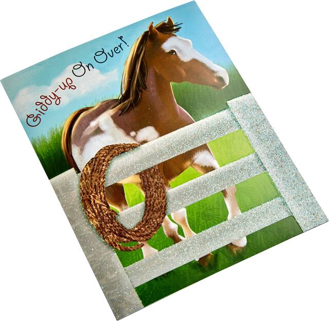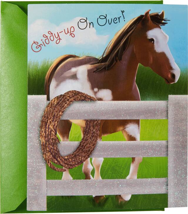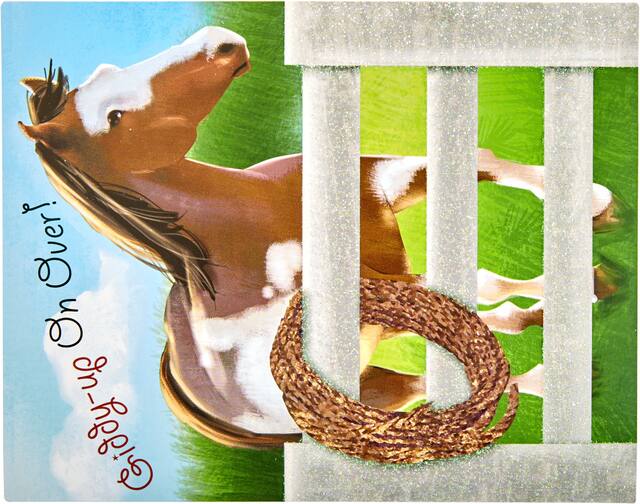 Ces produits similaires présentés ci-dessous pourraient vous intéresser.Invitations Cheval scintillant imprimée d'un cheval blanc et brun derrière une clôture à paillettes