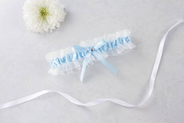 Ces produits similaires présentés ci-dessous pourraient vous intéresser.Jarretière de mariage en organza dotée d'un ruban de satin bleu pâle et d'organza blanc