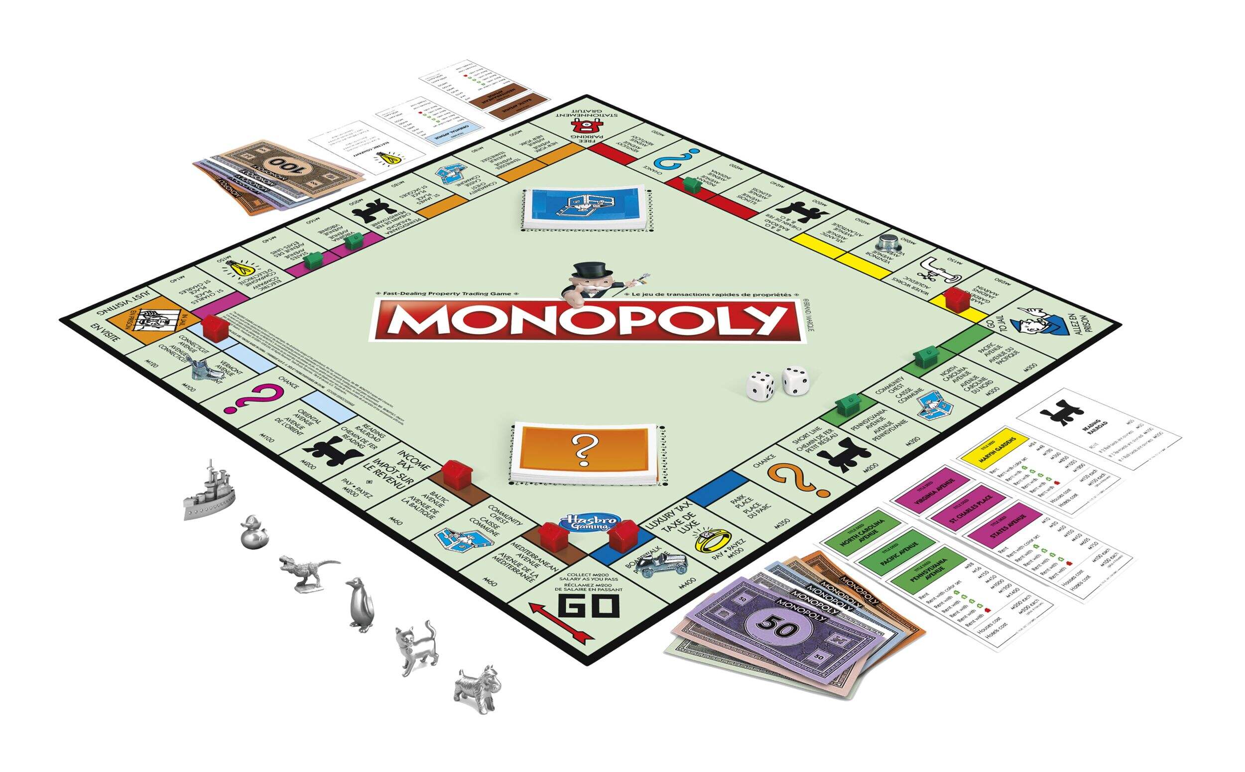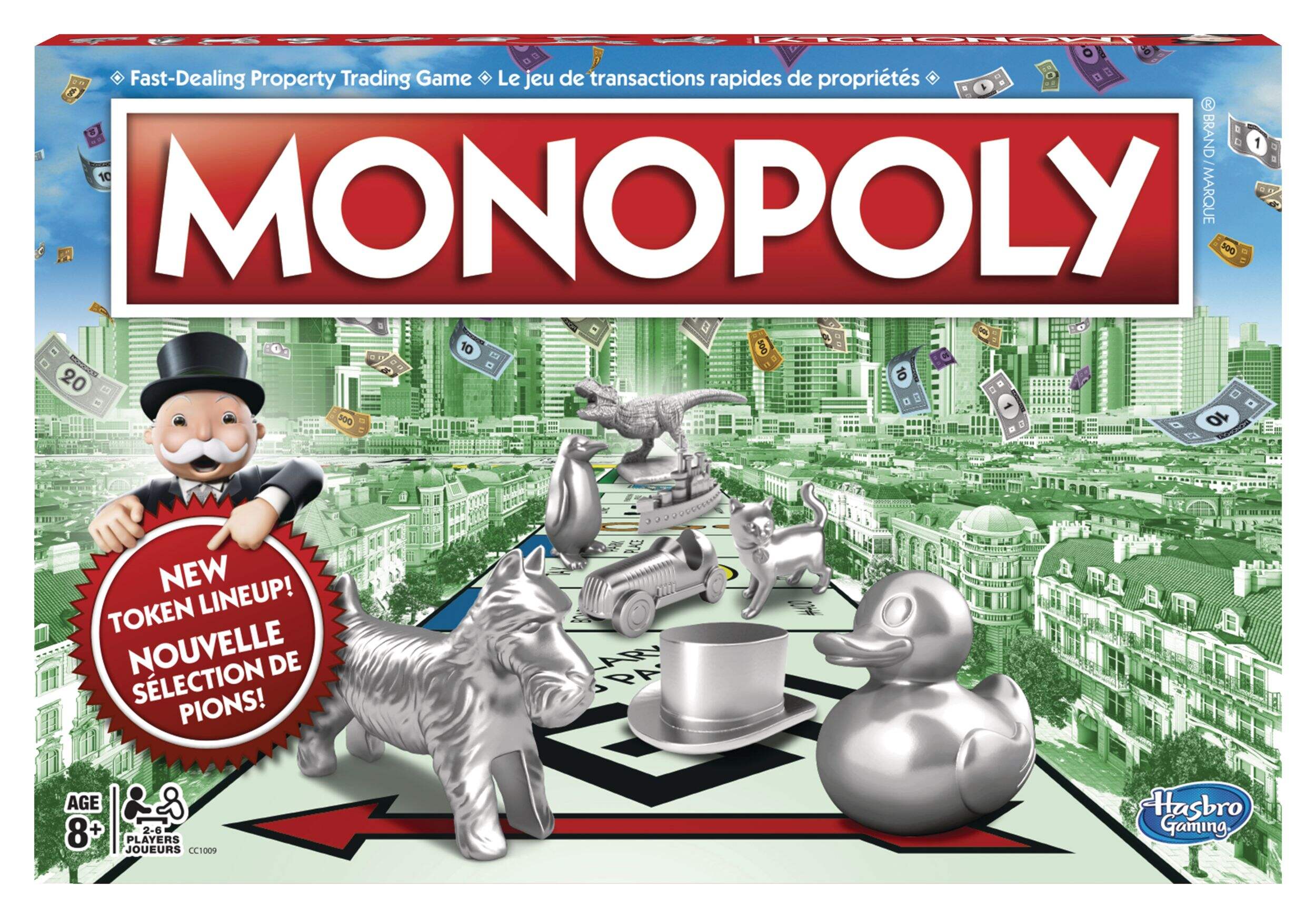 Comprend 8 jetons : haut-de-forme, canard en caoutchouc, Scotty, Hazel, voiture de course, pingouin, cuirassé et dé à coudre ou T-Rex