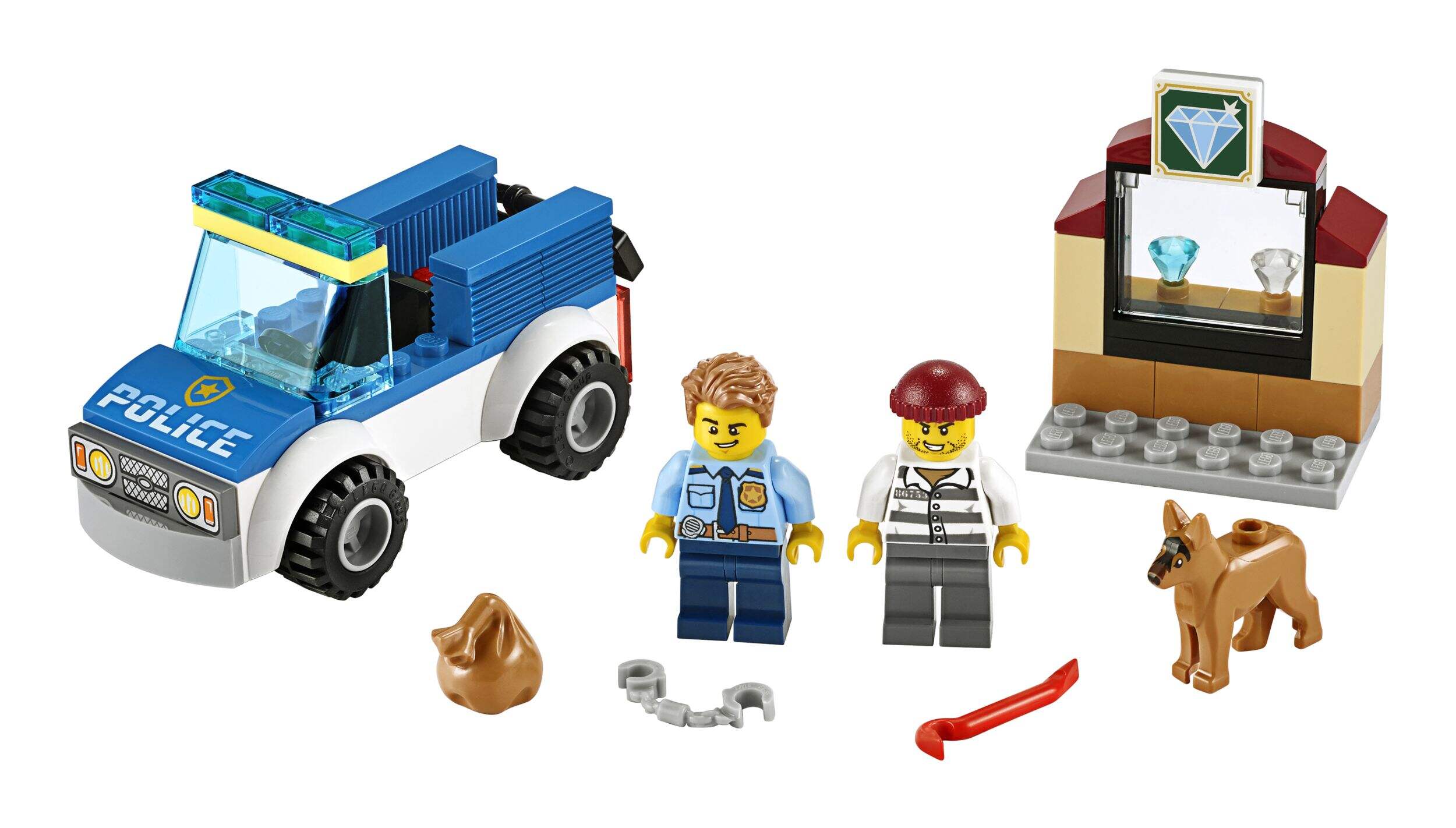 Que se trouve dans la boîte? Une voiture de police en jouet avec de l'espace pour le policier et son chien fidèle, une bijouterie avec 2 joyaux et un bandit muni d'un pied-de-biche avec un sac pour cacher son butin