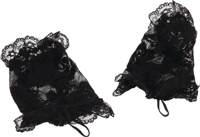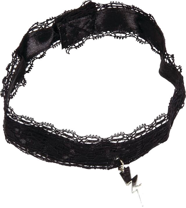 Comprend un collier étrangleur en dentelle avec une breloque argentée en forme d'éclair et des gants noirs en dentelle