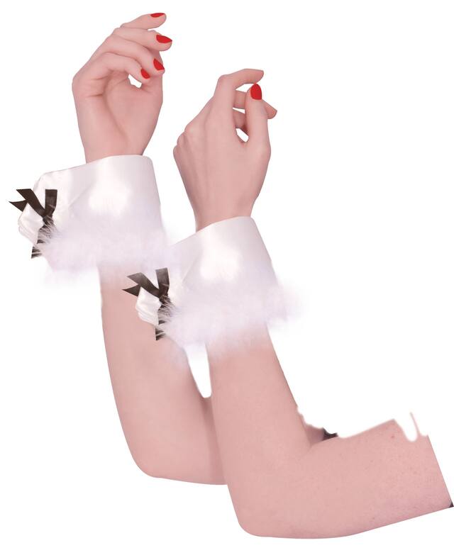 Manchettes de lapin faites de tissu blanc satiné doublé de plumes de marabout noires duveteuses