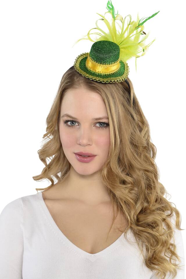 Ces produits similaires présentés ci-dessous pourraient vous intéresser.Mini-chapeau haut-de-forme fantaisiste vert étincelant qui ajoute une touche de vert pour la chance et une touche de paillettes pour un style étincelant