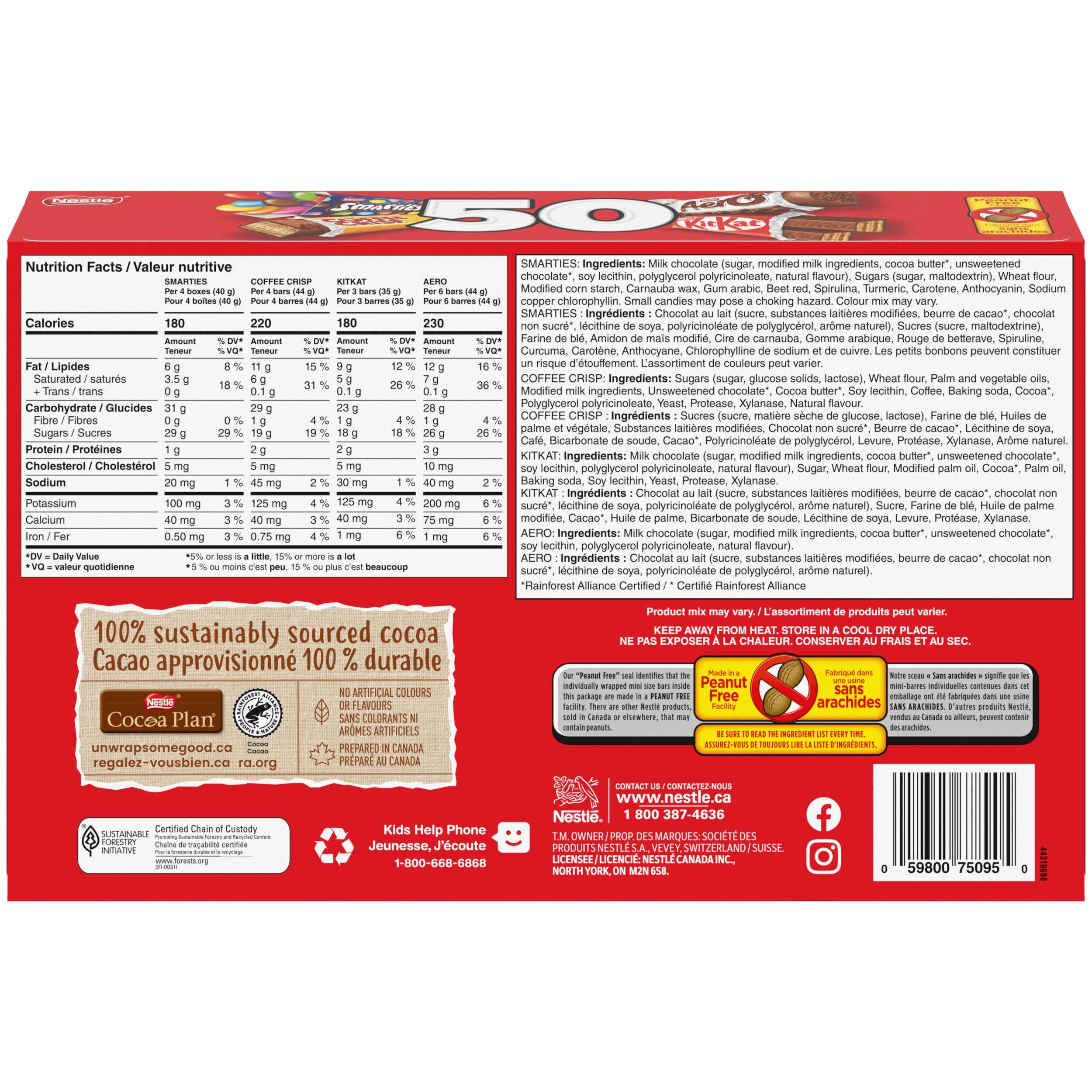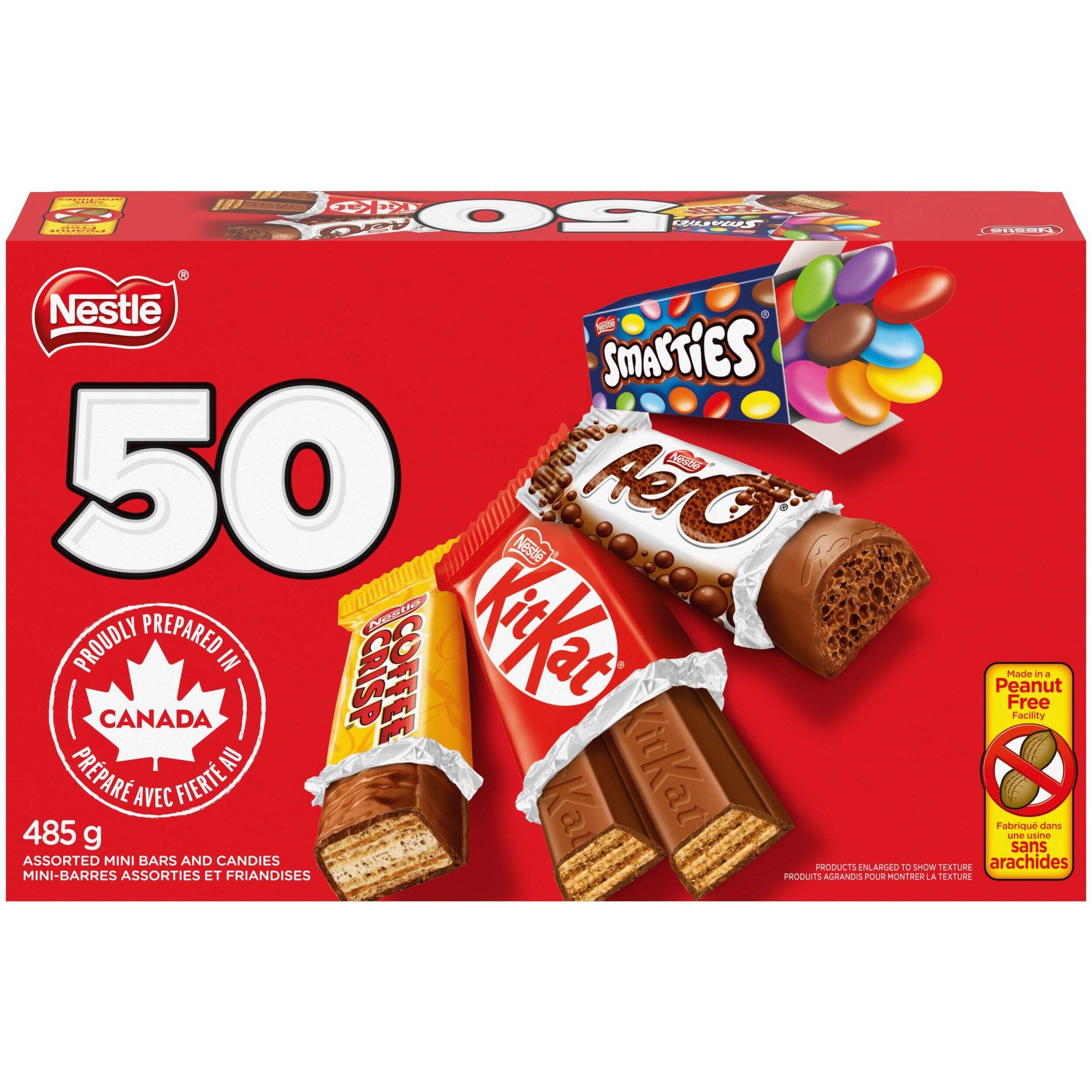 Ces produits similaires présentés ci-dessous pourraient vous intéresser.Assortiment varié de Mini Coffee Crisp/Kit Kat/Aero/Smarties Nestlé qui est la gâterie idéale pour les enfants qui passent l'Halloween. Boîte comprenant 50 mini-barres avec un excellent assortiment de produits Nestlé classiques: Coffee Crisp, Kit Kat, Aero et Smarties. Chaque mini-barre de chocolat au lait sans arachides est emballée individuellement, ce qui en fait un emballage de 50 idéal à distribuer à l'Halloween ou à emporter dans les lunchs et les collations. Avec toutes vos marques de friandises Nestlé préférées regroupées dans une seule boîte, cet assortiment d'Halloween plaira à coup sûr aux enfants et aux adultes.