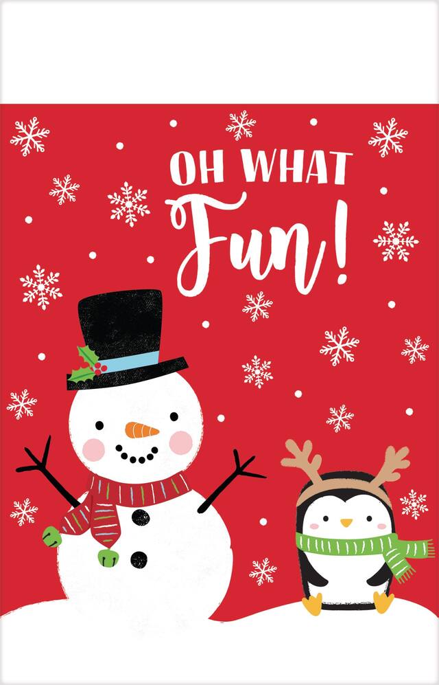 Nappe en plastique dotée d'un centre blanc et d'une bordure avec un motif répété d'un pingouin et de son ami le bonhomme de neige