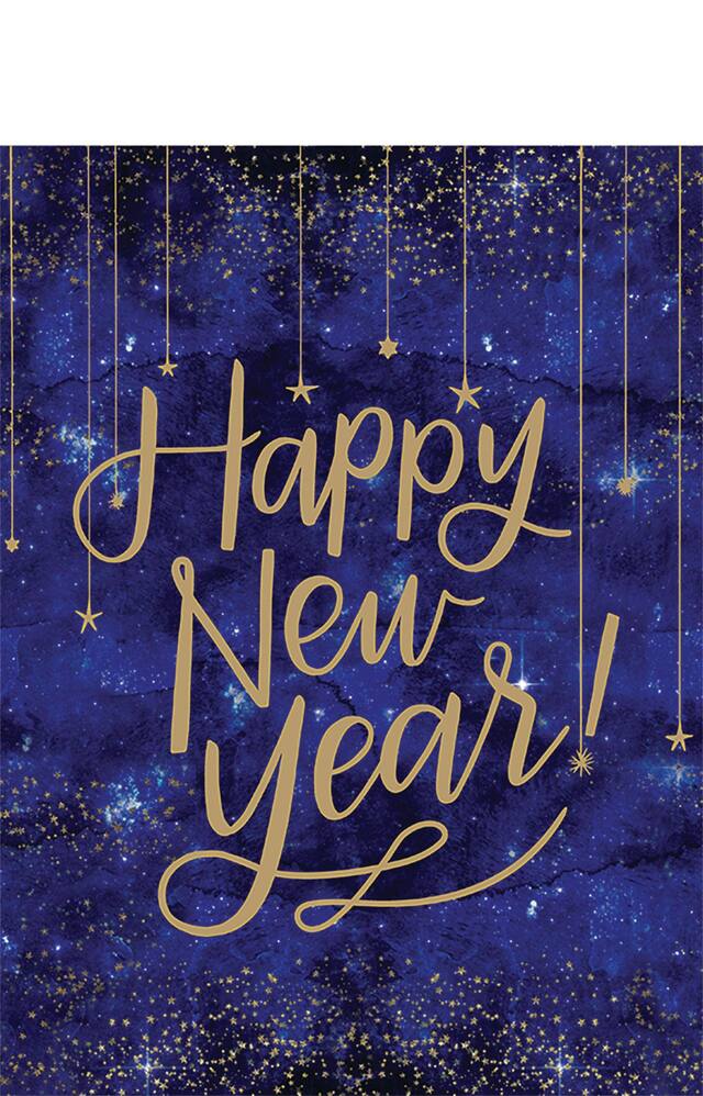 • Nappe en plastique dotée d'un motif bleu sur les bords avec une mention dorée « Happy New Year » et des étoiles dorées