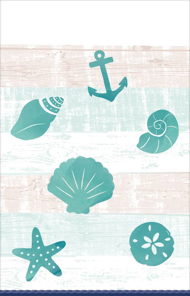 Nappe en plastique dotée de coquillages turquoise, d'une ancre et d'une étoile de mer le long des bordures
