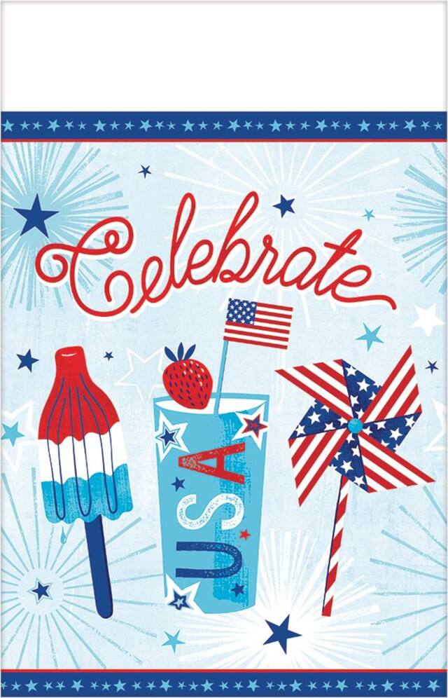 Nappe en plastique dotée de sucettes glacées rouges, blanches et bleues et de drapeaux américains avec mention « Celebrate USA » imprimés sur un fond bleu pâle sur les bords