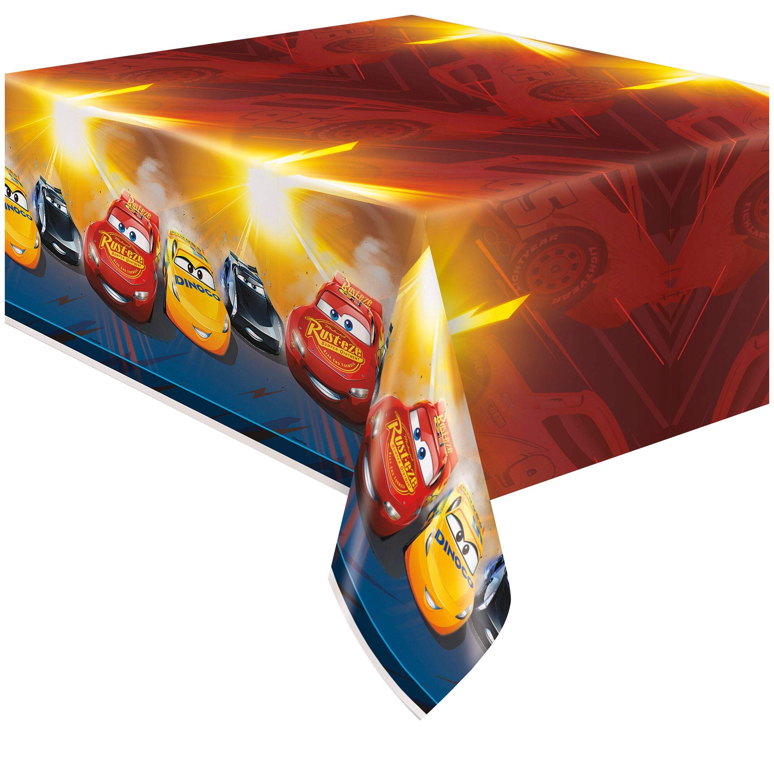 Cette nappe réutilisable Disney Cars 3 ultra pratique présente un motif de bordure sur le thème de la course avec Cruz Ramirez, Flash McQueen et Jackson Storm - parfait pour ajouter une touche amusante à la prochaine fête d'anniversaire de votre enfant. Mesurant 54 po de large sur 96 po de long, cette nappe en plastique est facile à nettoyer après usage, ce qui la rend idéale pour les célébrations à l'intérieur comme à l'extérieur. Il suffit de l'étendre, de profiter des festivités, puis de la ranger pour une autre fois!