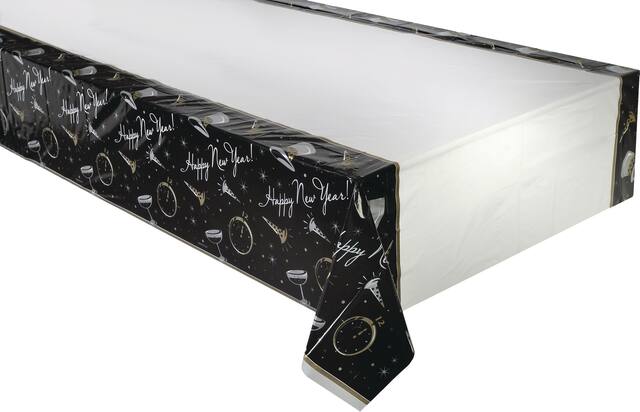 Nappes élégantes en plastique dotées d'une palette de couleurs noire, argent et or, et décorées de chapeaux de fête, de trompettes, de verres à champagne, d'une horloge sonnant minuit avec mention « Happy New Year »