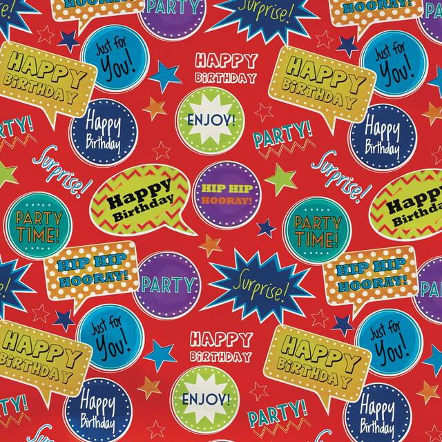 Ces produits similaires présentés ci-dessous pourraient vous intéresser.Papier d'emballage d'anniversaire amusant avec des phrases comme « Hip Hip Hooray » et « Just for You »