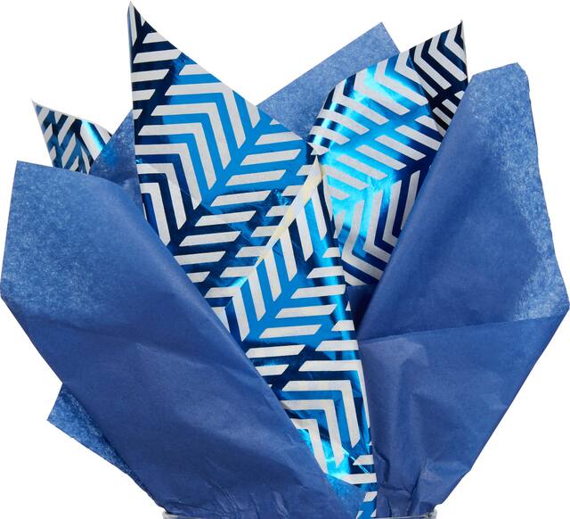 Ces produits similaires présentés ci-dessous pourraient vous intéresser.Papier de soie avec chevrons bleu métallique qui sera parfait pour un emballage-cadeau, peu importe l'occasion
