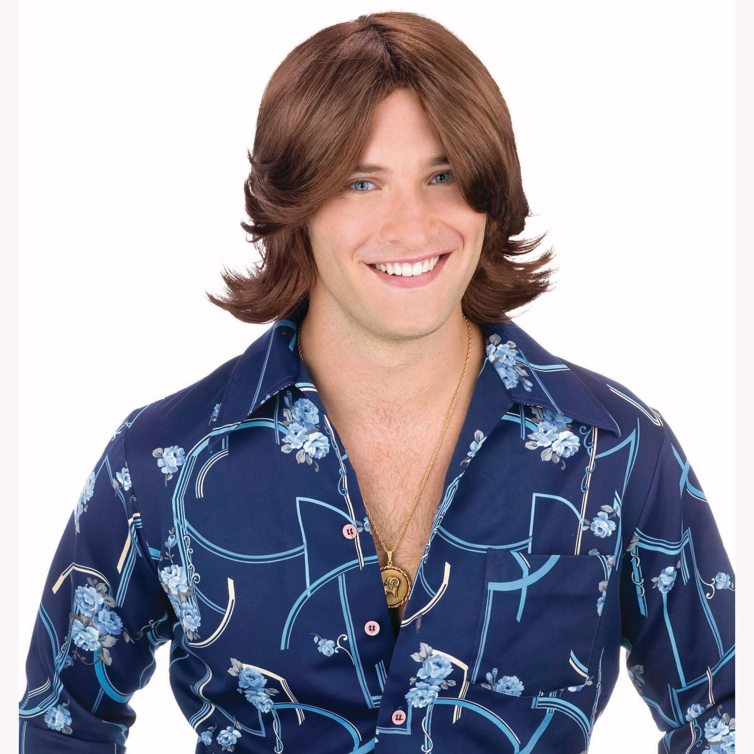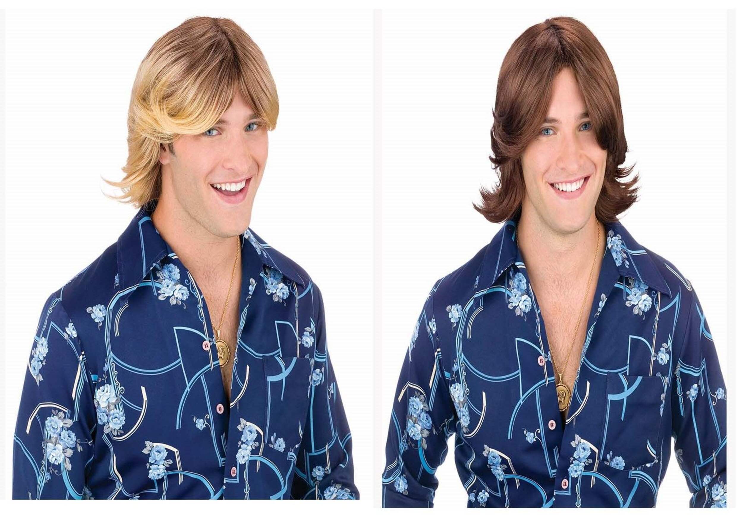• Perruque prenant la forme d'une coupe de cheveux blonds cendrés de longueur moyenne rappelant le style classique des années 1970