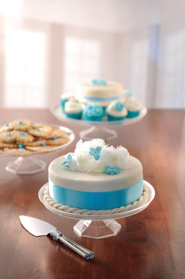 Petit présentoir à gâteaux en plastique transparent de style contemporain avec socle à enclenchement qui peut être retiré après la fête et rangé
