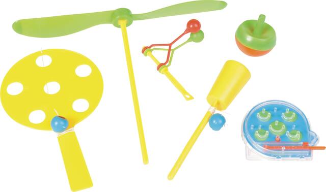 • Comprend 8 hélicoptères tournoyants, 8 jeux de coupe et de balles, 8 jeux Hi Lo, 8 jeux de billard électrique, 8 mini claquettes et 8 toupies