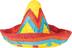 Pinata rouge, orange, jaune et turquoise ressemblant à un chapeau mexicain classique avec un large bord recourbé et une couronne haute