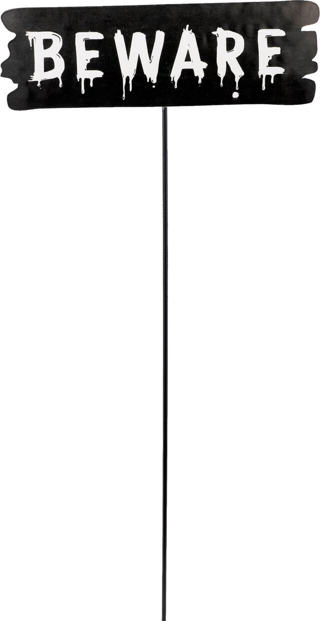 Décoration d'extérieur dotée d'un titre blanc « Beware » sur un panneau dentelé en métal noir fixé à un piquet en métal noir