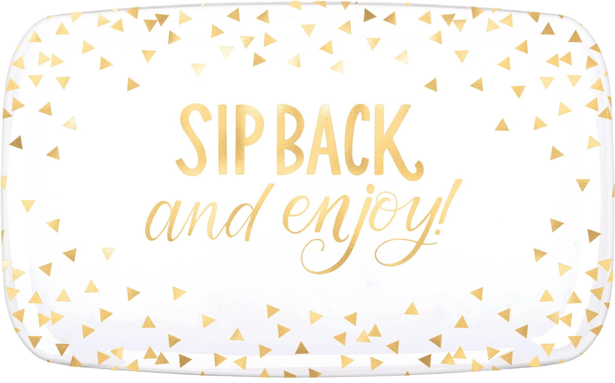 Chaque plateau blanc est doté du message « Sip Back & Enjoy » en lettres dorées avec une bordure de confettis assortie