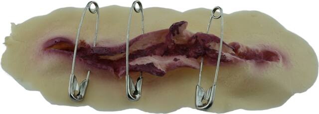 Prothèse d'épingle de sûreté qui est épouvantablement géniale! Prothèse en latex de fausse chair dotée d'une entaille sanglante maintenue à l'aide de 3 épingles de sûreté