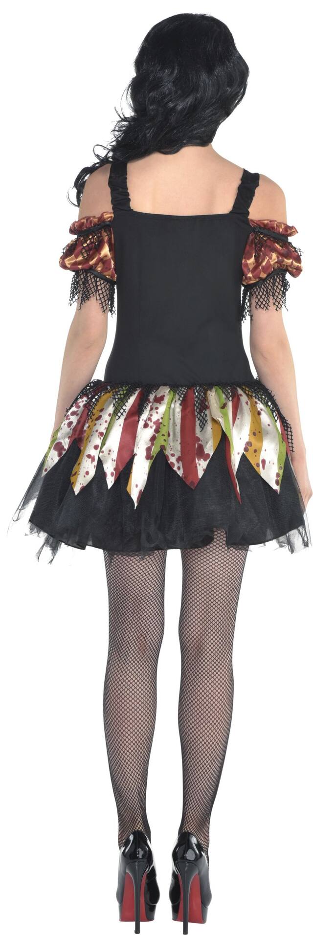 Ces produits similaires présentés ci-dessous pourraient vous intéresser.Robe de clown sanglante pour femme à rayures multicolores avec des boutons à pompon bleu, rouge et jaune à l'avant et des éclaboussures de faux sang, des bretelles noires et des détails en filet noir