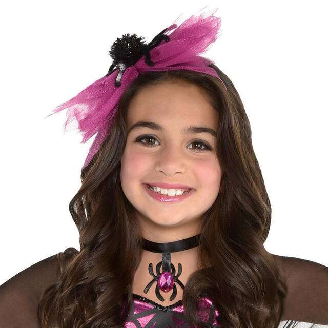 Comprend un serre-tête avec une araignée et une tulle rose, ainsi qu'un collier avec une araignée
