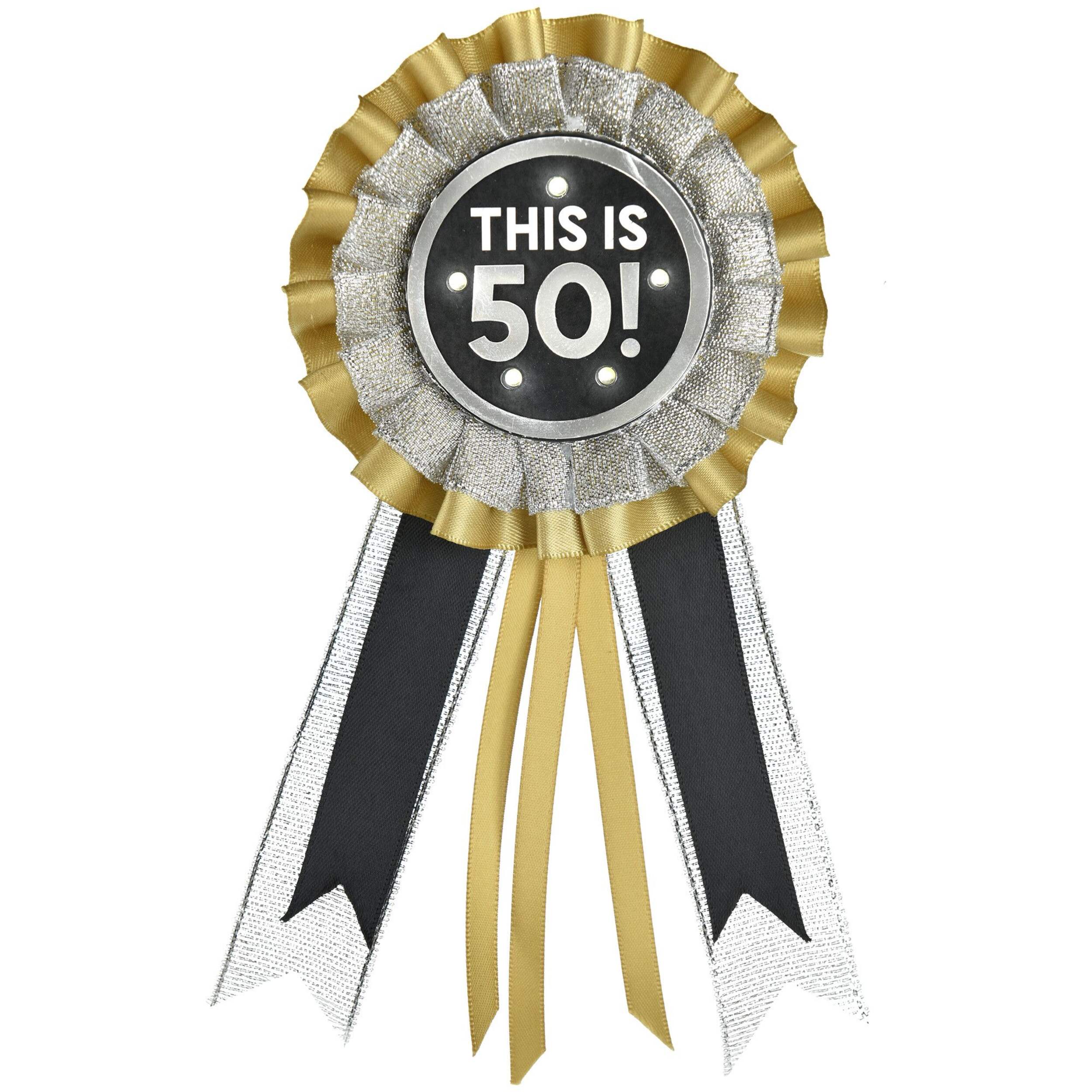 Bouton du centre indiquant This is 50! avec tissu doré et un ruban argenté à paillettes