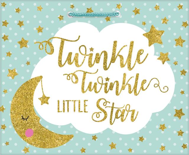 • Sac-cadeau en papier bleu clair orné d'un nuage comportant l'inscription « Twinkle Twinkle Little Star » et orné d'une lune et d'étoiles en paillettes dorées