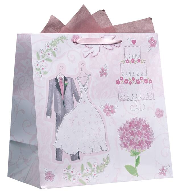 • Sac-cadeau de mariage 3D orné d'un motif de croquis mats sur le thème du mariage, comme des fleurs, une pièce montée blanche et des tenues de mariage