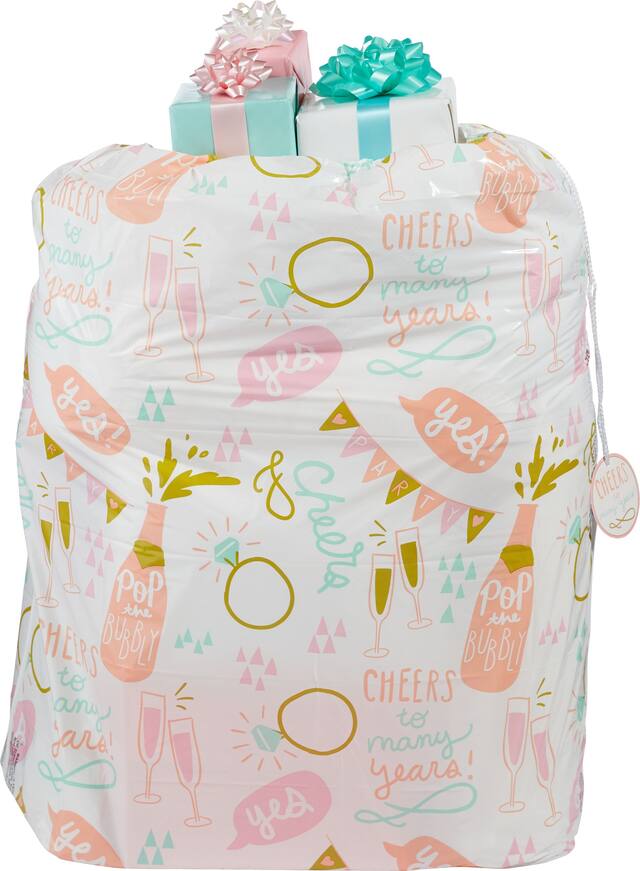 Sac en plastique blanc comportant l'inscription « Pop the Bubbly » et « Cheers To Many Years » entourée de verres à champagne, de bagues à diamant et de bannières imprimés