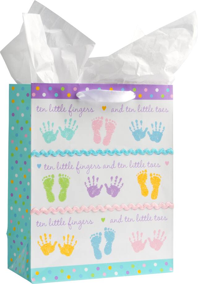 Ces produits similaires présentés ci-dessous pourraient vous intéresser.Sac-cadeau Ten Little Ones orné d'empreintes de mains et de pieds, d'une bordure à pois et d'une garniture en ruban
