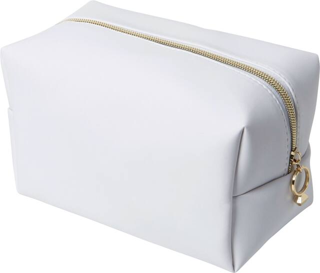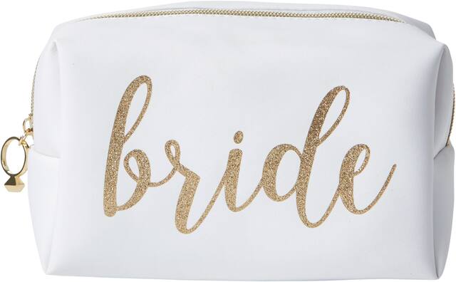 • Tissu blanc et sac en mousse dotés de la mention « Bride » dorée et d'une fermeture à glissière en métal doré qui ressemble à une bague en diamant