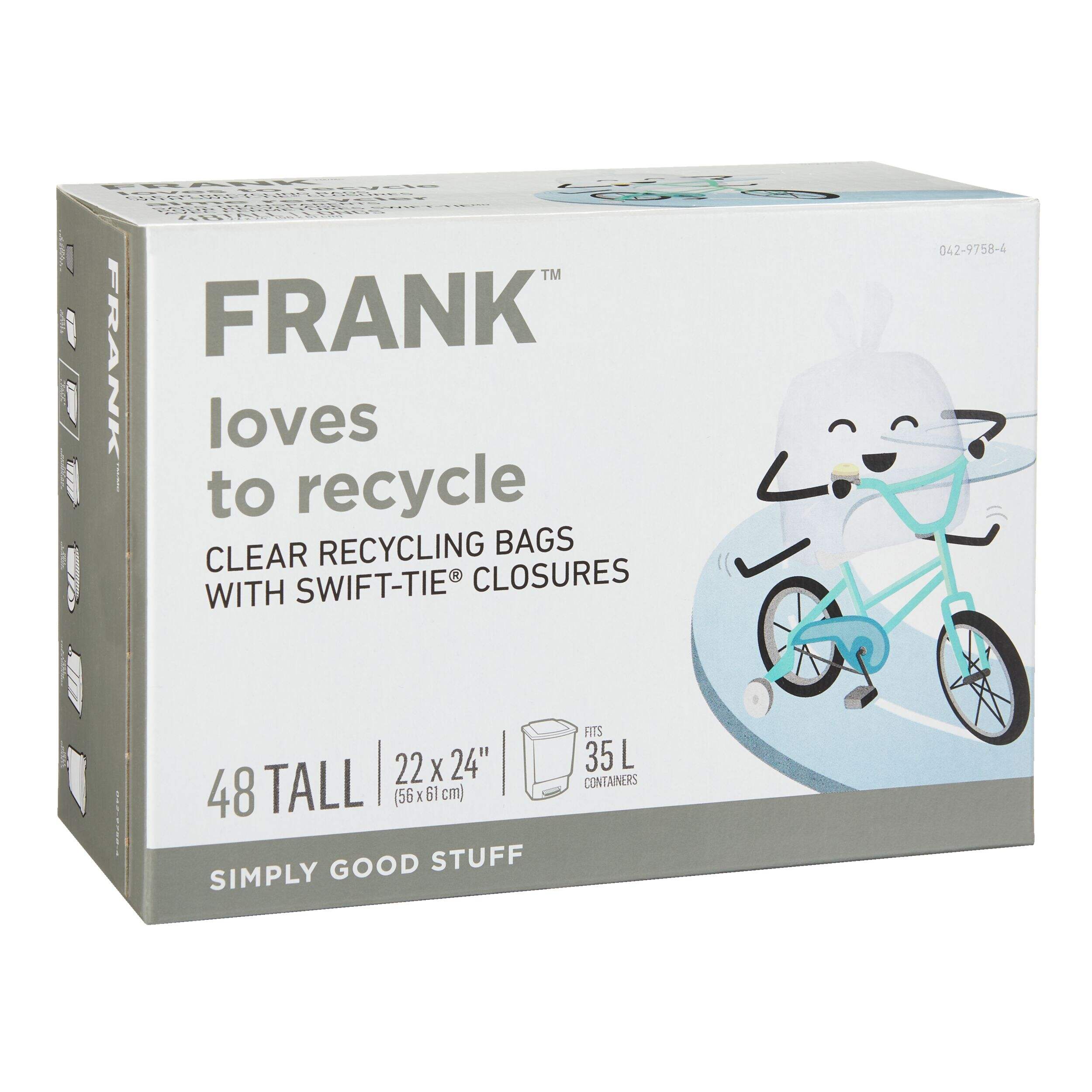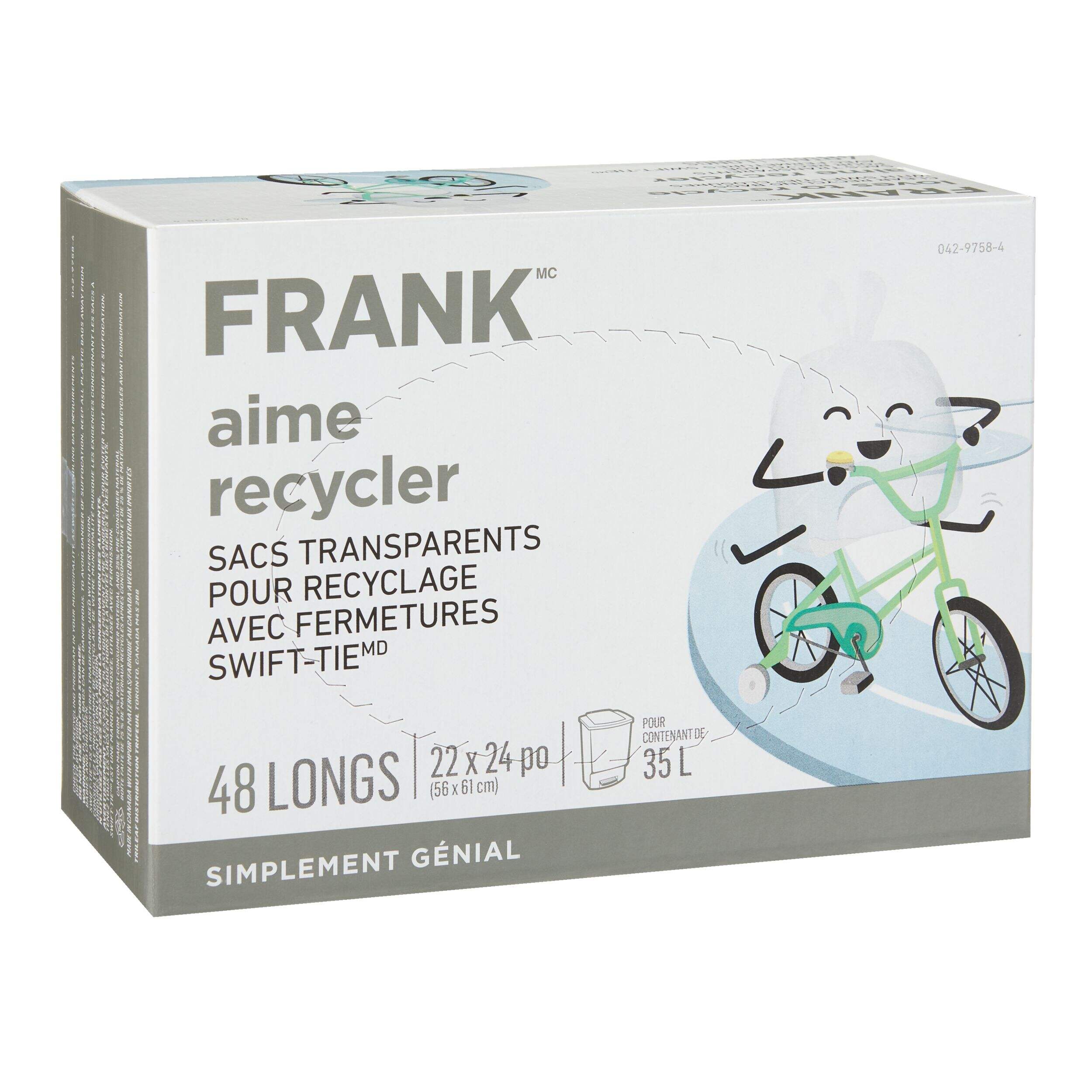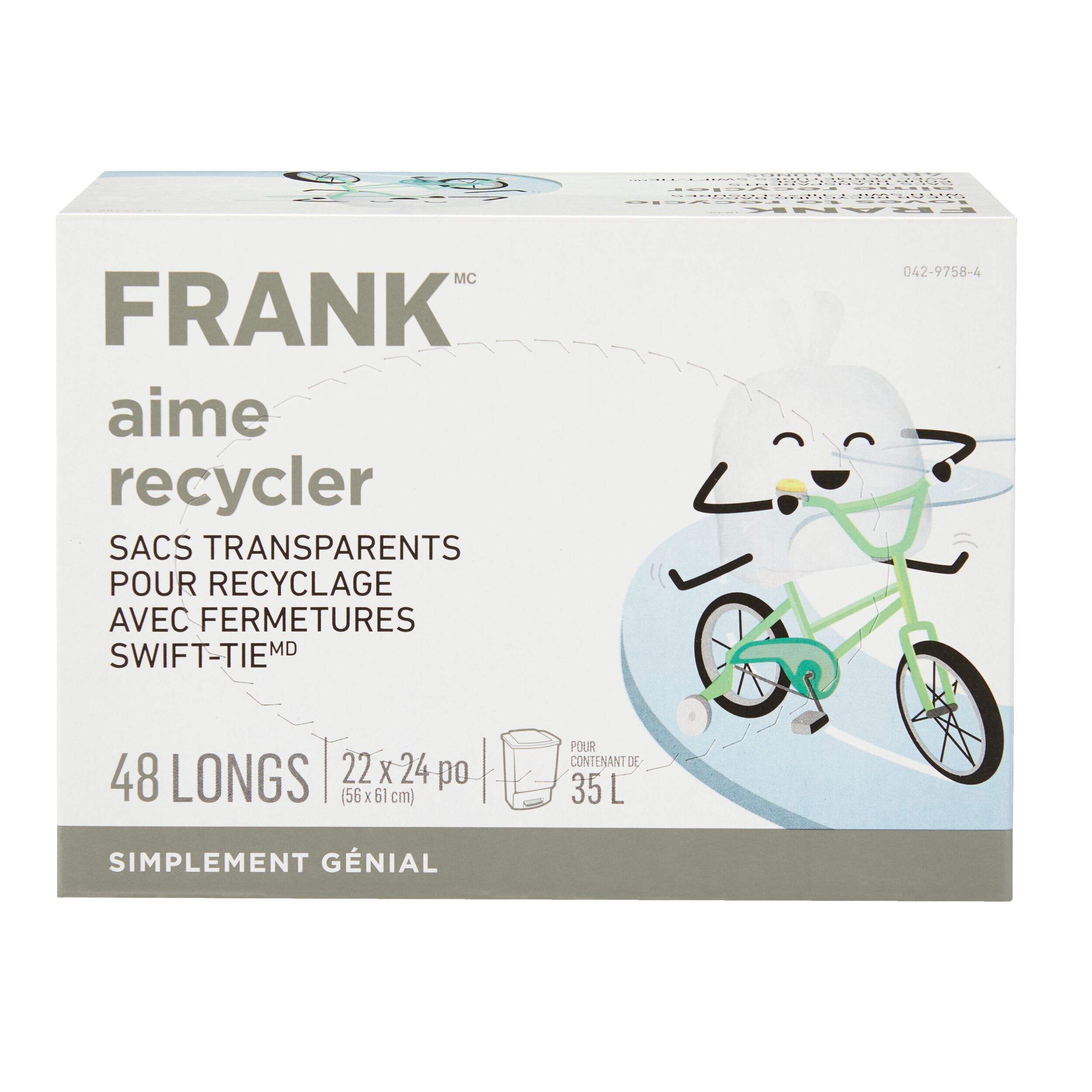 Le recyclage est plus facile que jamais avec ces grands sacs de recyclage FRANK à attache Swift-Tie qui sont robustes, flexibles et durables. Les sacs de grande taille en polyéthylène sont parfaits pour recueillir le plastique, le carton et d'autres matières recyclables, et ils peuvent contenir de grandes quantités de déchets. Ces sacs transparents, garantis 1 an, permettent d'identifier facilement le contenu et de gérer votre recyclage.