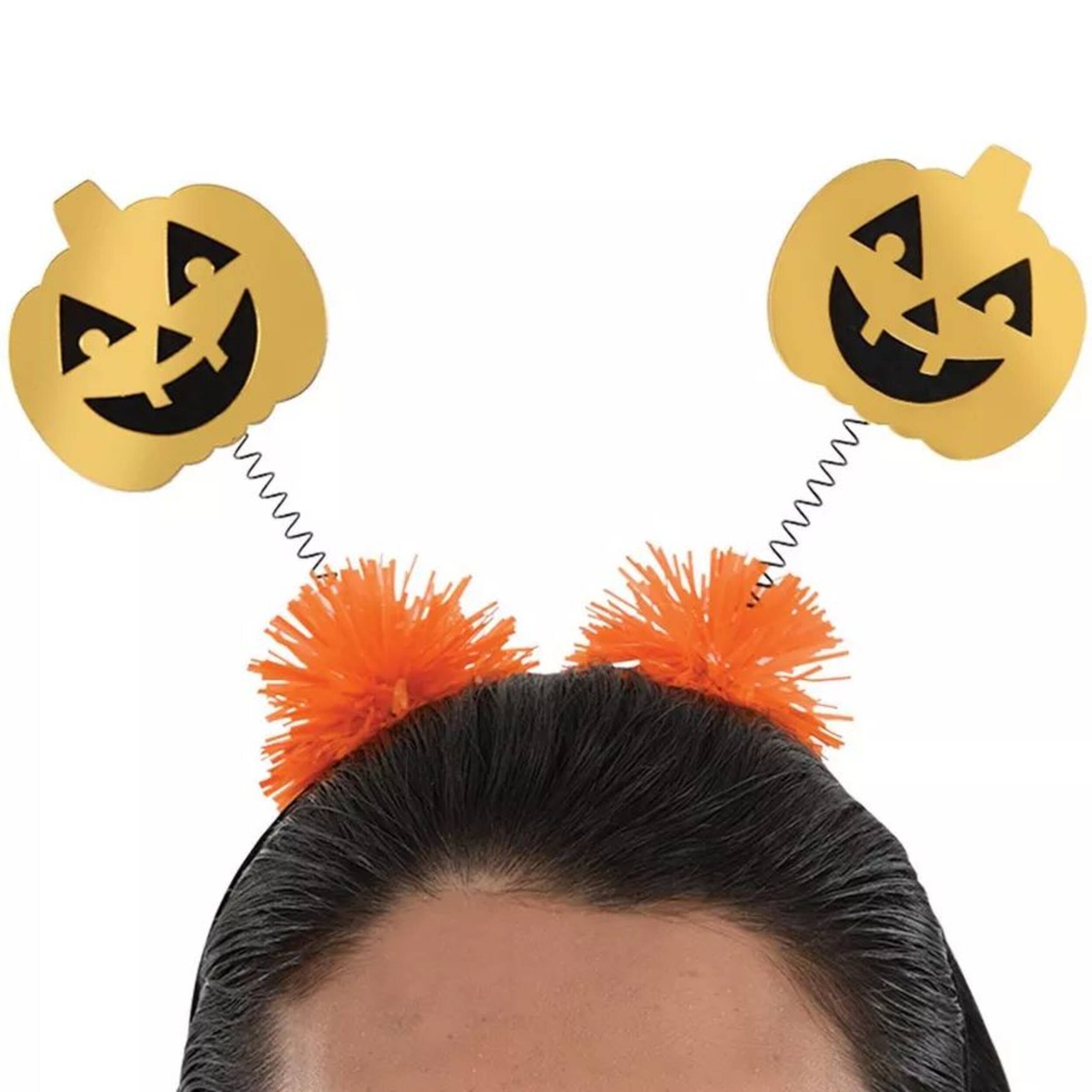 Serre-tête à antennes citrouilles joyeuses qui est un serre-tête en plastique recouvert de tissu avec 2 citrouilles lanternes souriantes à ressorts
