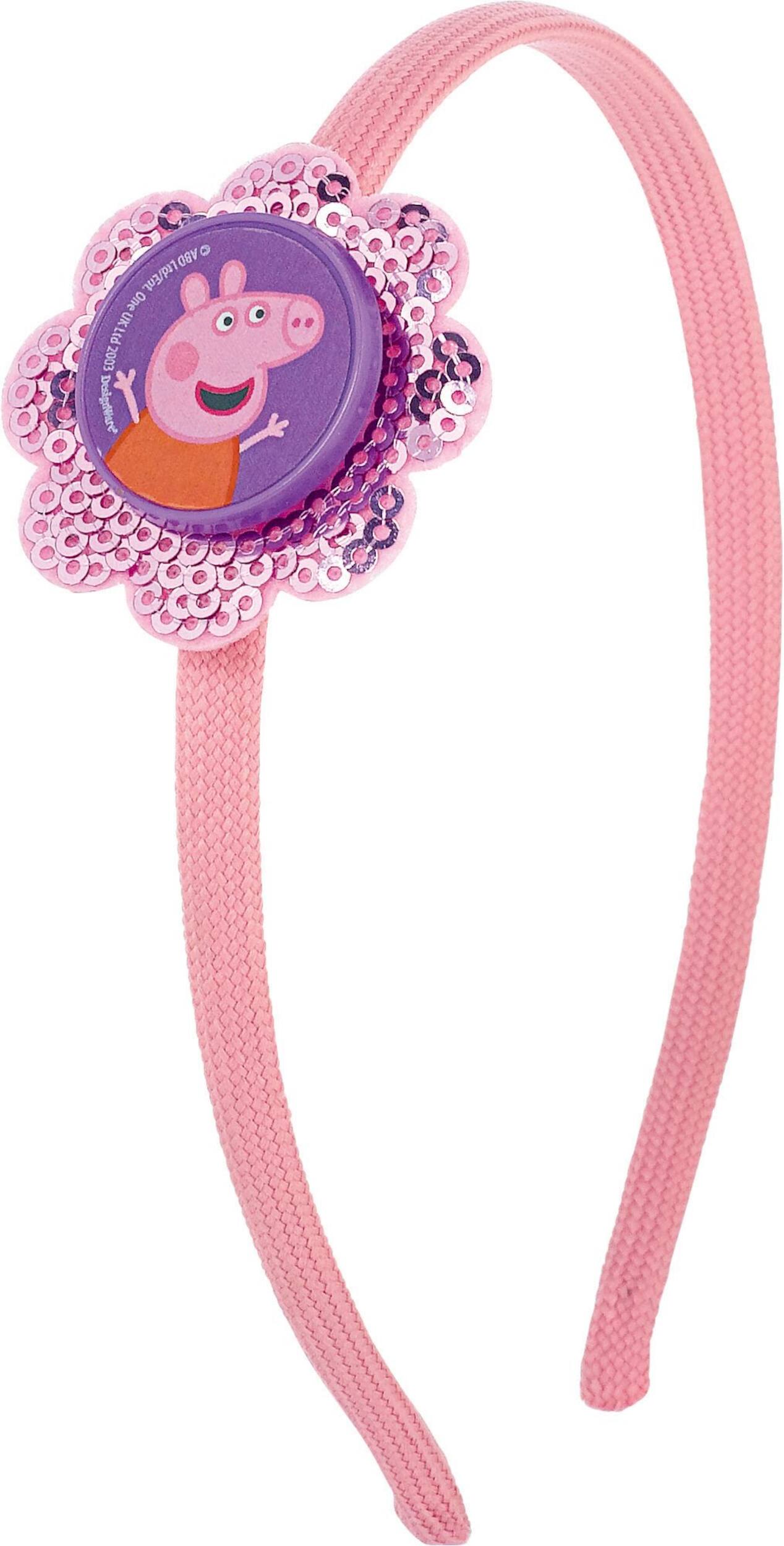 Serre-tête rose orné d'un camée à l'effigie de Peppa entouré d'une marguerite en feutre rose à paillettes pour compléter joliment n'importe quelle tenue
